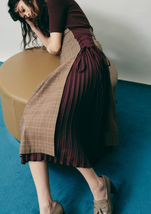 シーズンムード香るチェック柄スカートと軽やかなプリーツスカートを合わせた、異素材ドッキングスカート。クラシカル×エレガントという相反する素材を組み合わせ、「Lily Brown」ならではのヴィンテージシックへと落とし込みました。サイドのレースアップが女性らしさを際立たせ、裾から覗くプリーツが軽やかな足元を演出。腰位置高めに設定したウエストは脚長効果を叶え、ウエスト後ろにはゴムをあしらい着心地も抜群です。