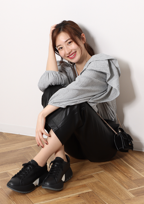 取り入れやすいボトムスでレザーを取り入れて、ハードになりすぎないよう、トップスはフリルデザインのものをチョイスしました。