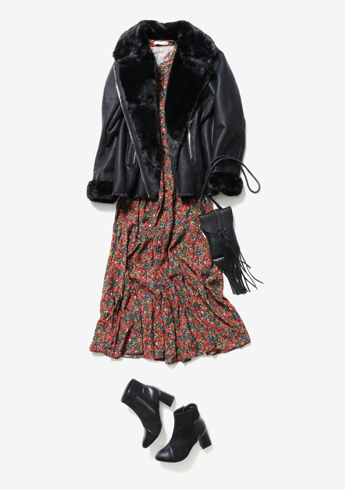 ブラックコーデは花柄ワンピースで華やかに2019.10.28 -