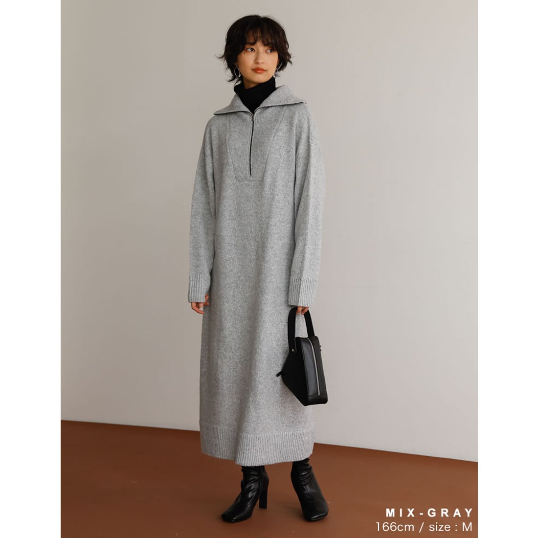 首元を大きく開けることで抜け感を演出できるハーフジップのワンピース。インナーにタートルネックを合わせて、レイヤードスタイルを楽しんで。