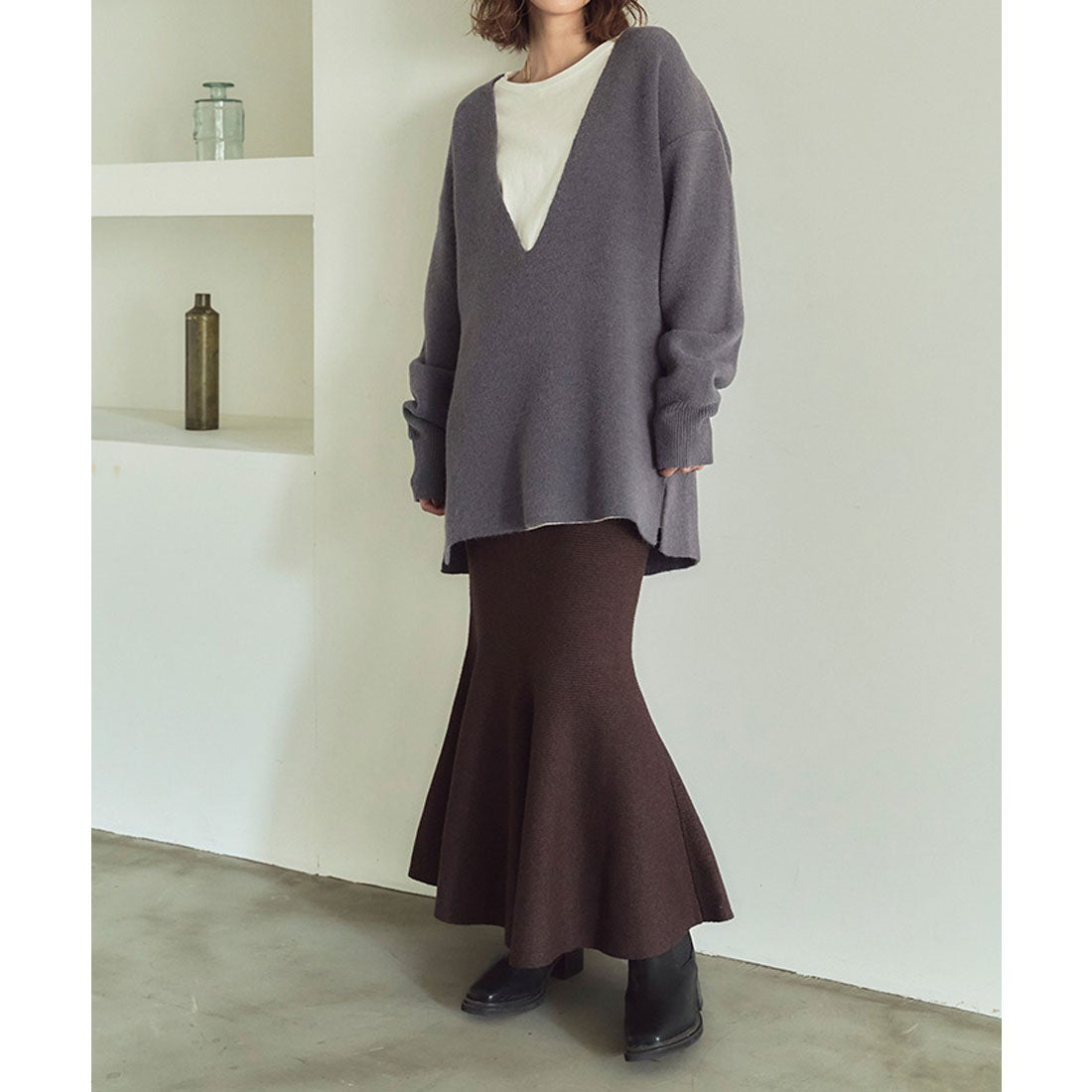 レイヤードスタイルが楽しめる深めのVネックニット。ボトムスは身体のラインが出るものを選ぶとカジュアルになりすぎず大人っぽい印象に◎