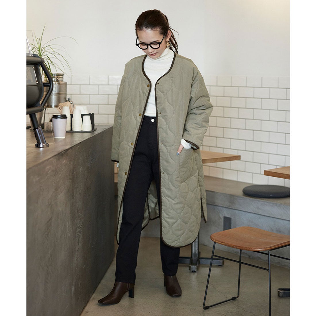 今季はキルティング素材のコートが大流行!お尻まですっぽり隠れる丈なら温かさも◎ 野暮ったくならないよう、ボトムスはハイウエストのものを選んで。