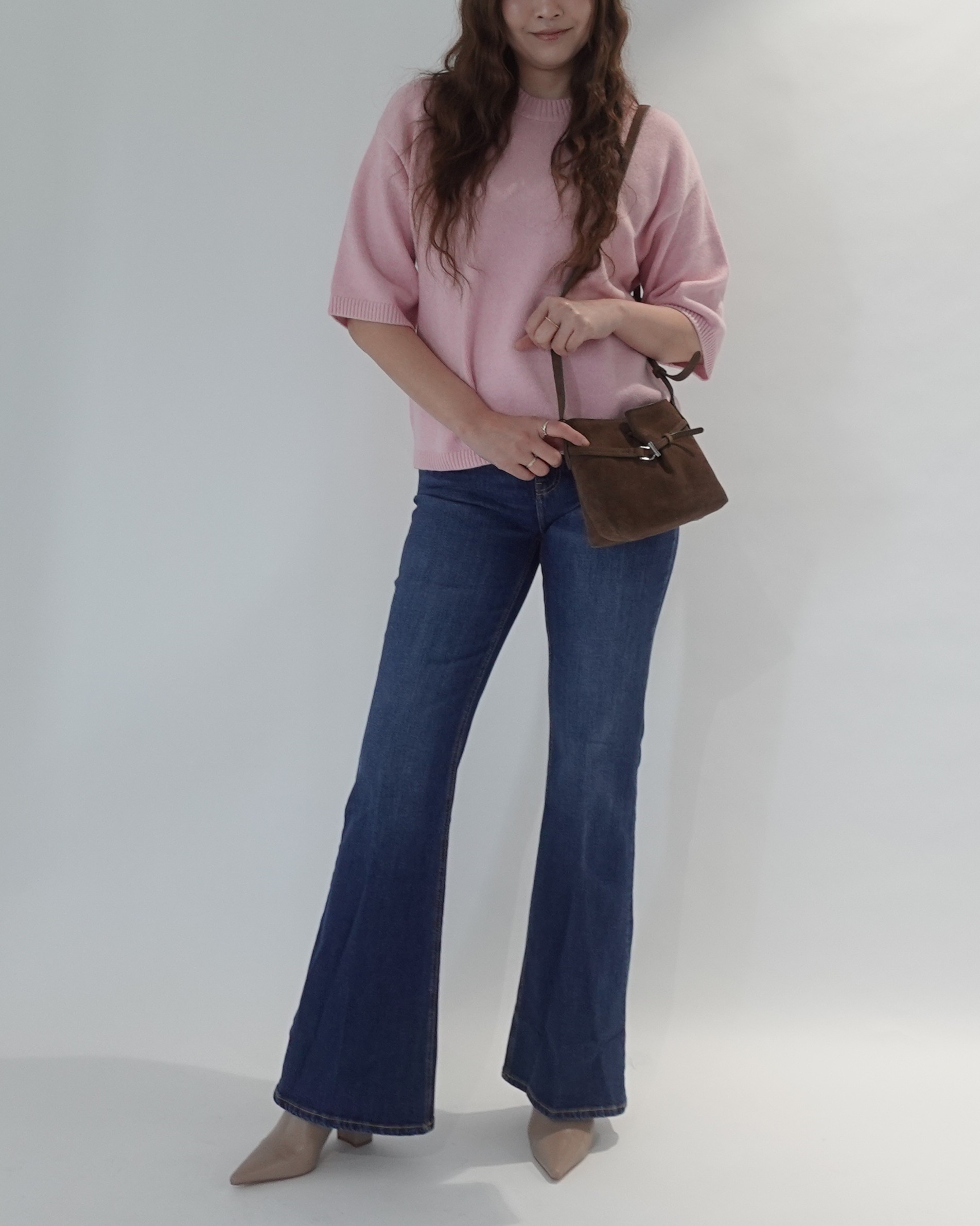 春の訪れを感じさせる淡いピンクの半袖ニットを主役に、シルエットの美しいフレアデニムを合わせた大人カジュアル。