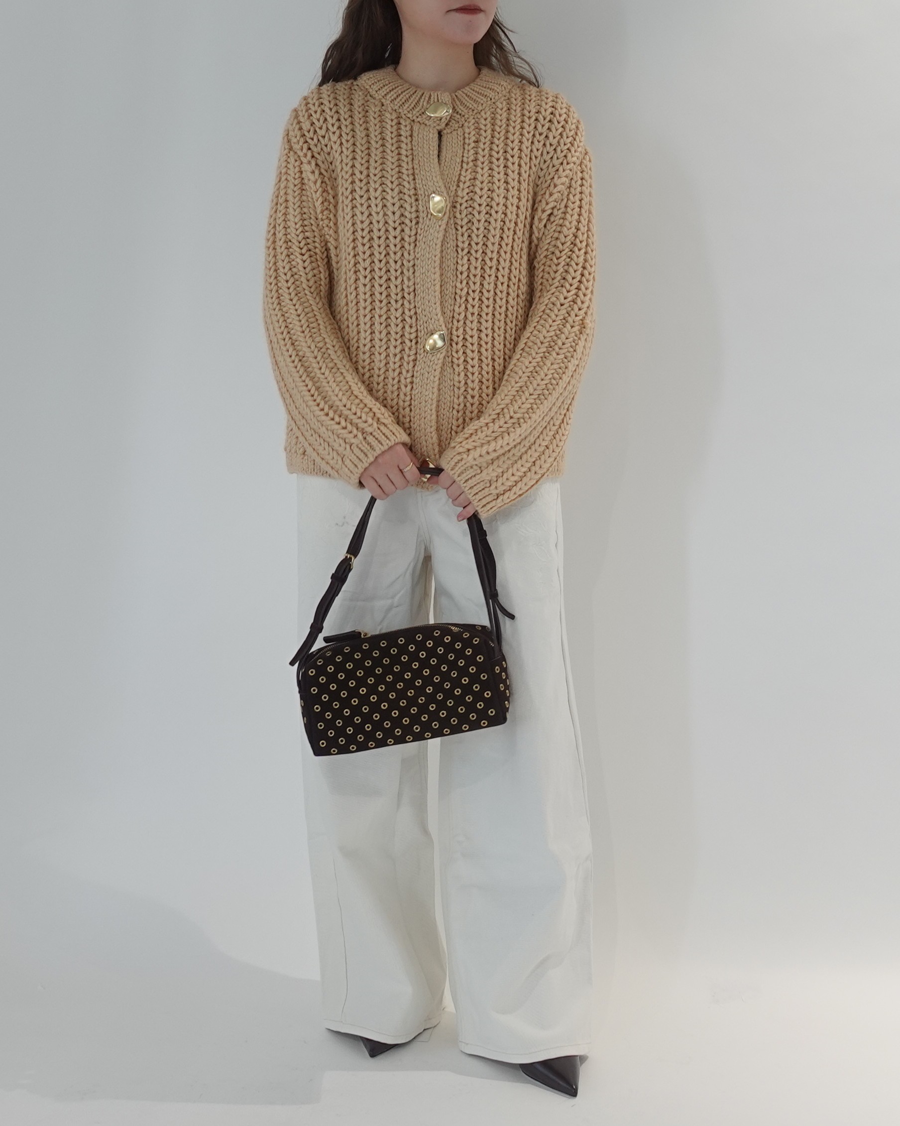 柔らかなベージュのニットカーディガンに、クリーンなホワイトデニムを合わせた春らしさ満点の装い。