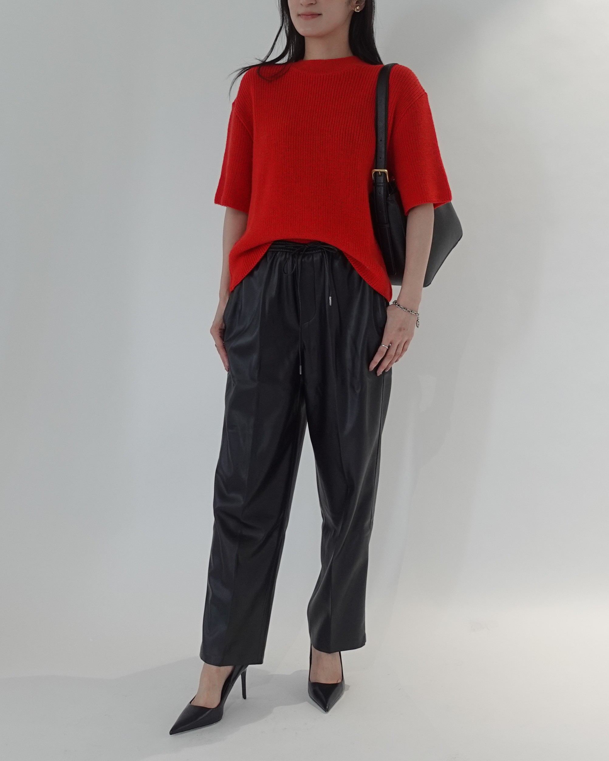 鮮やかな赤の春ニットを、ブラックのレザーパンツで辛口に引き締めた都会的なスタイル。