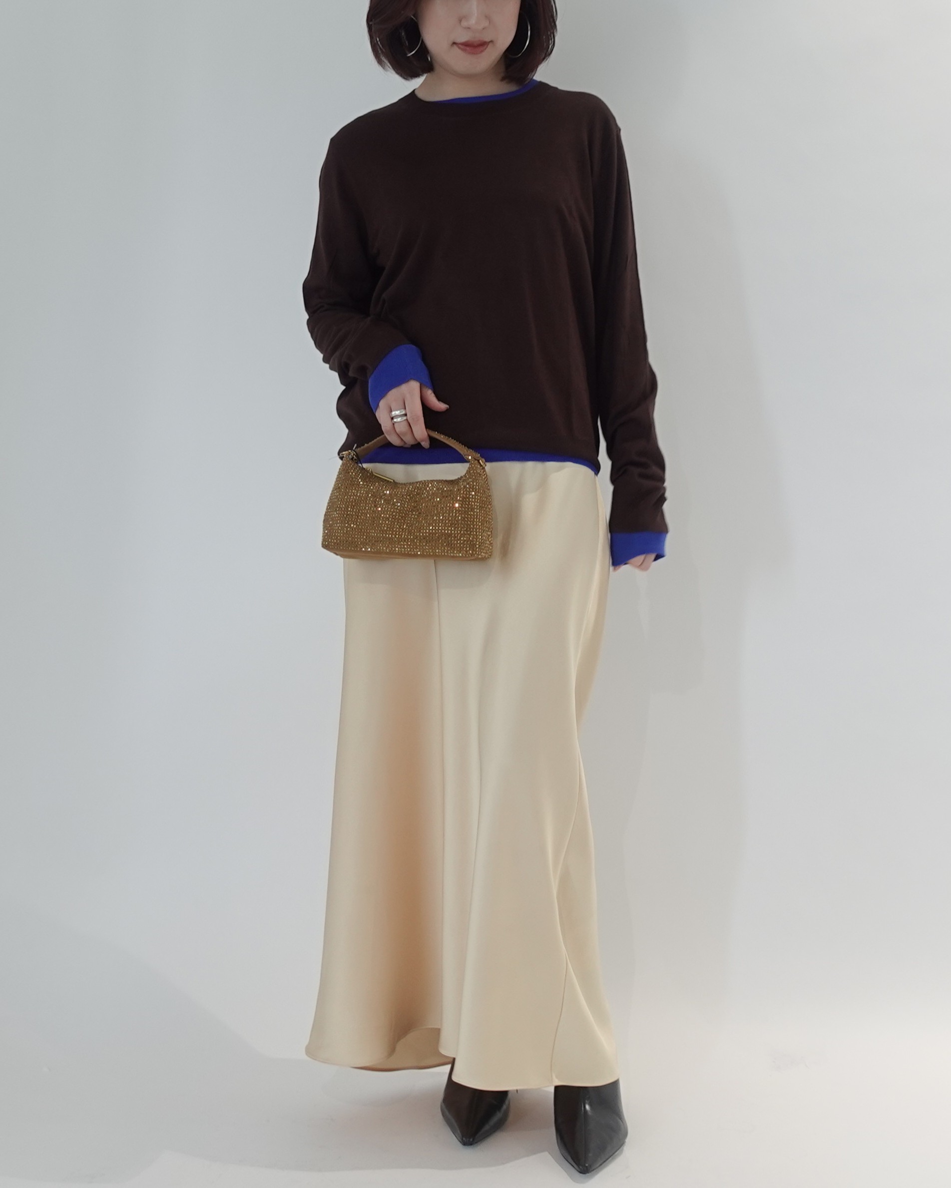 ブラウンのバッグが、全体の彩度を上品に整えます。
