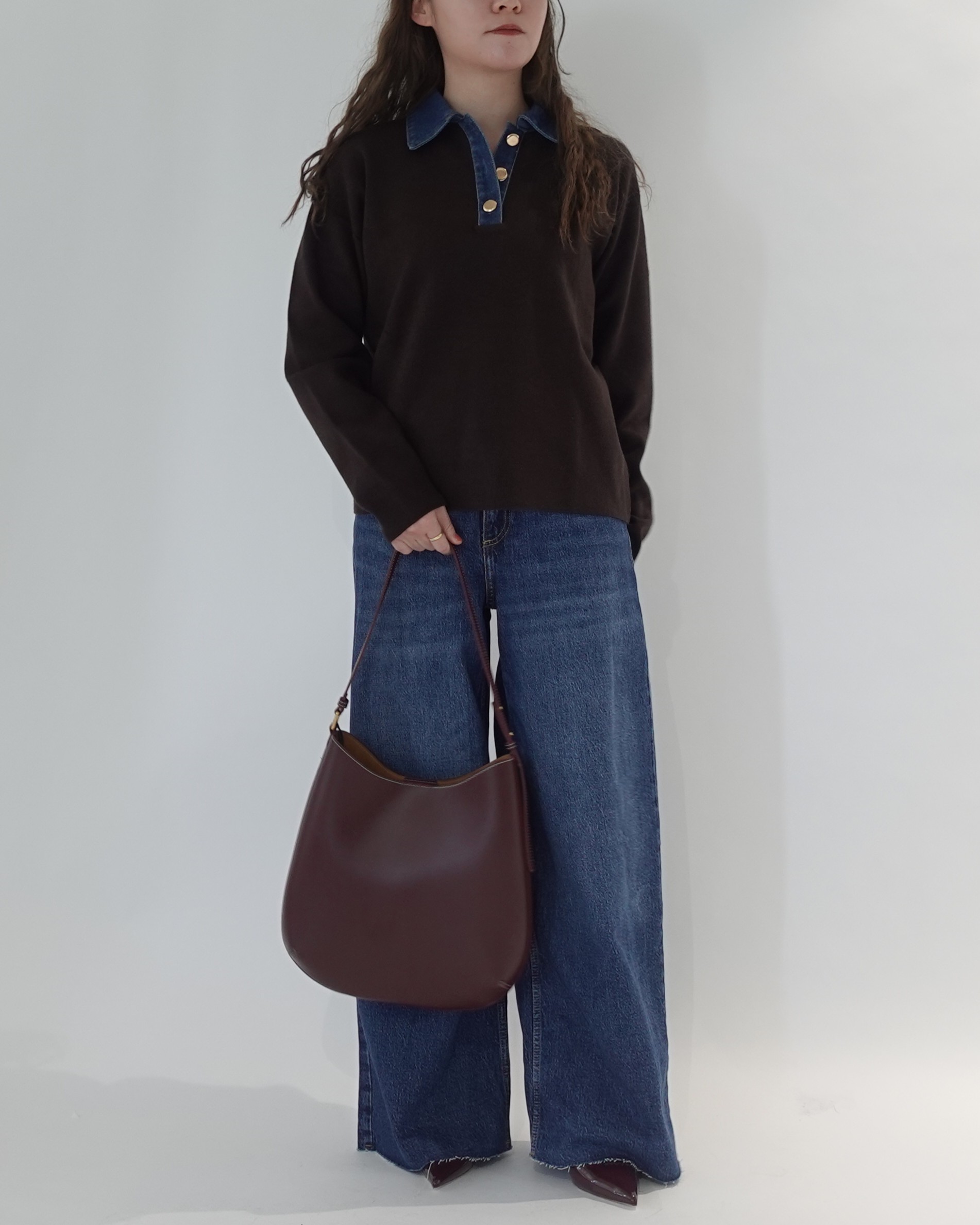 深みのあるブラウンニットの襟元にデニムを効かせた、小技の光るスタイル。