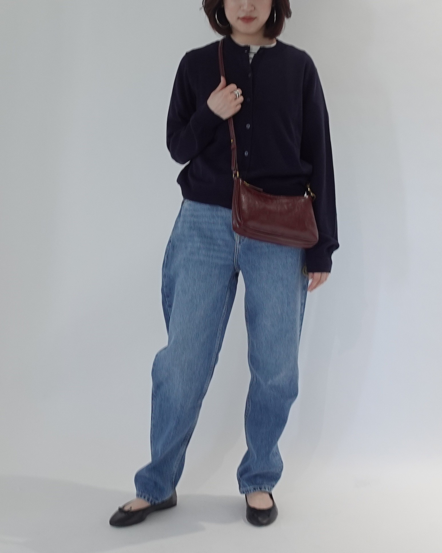 ボルドーのバッグを差し色に、上品な大人カジュアルの完成です。