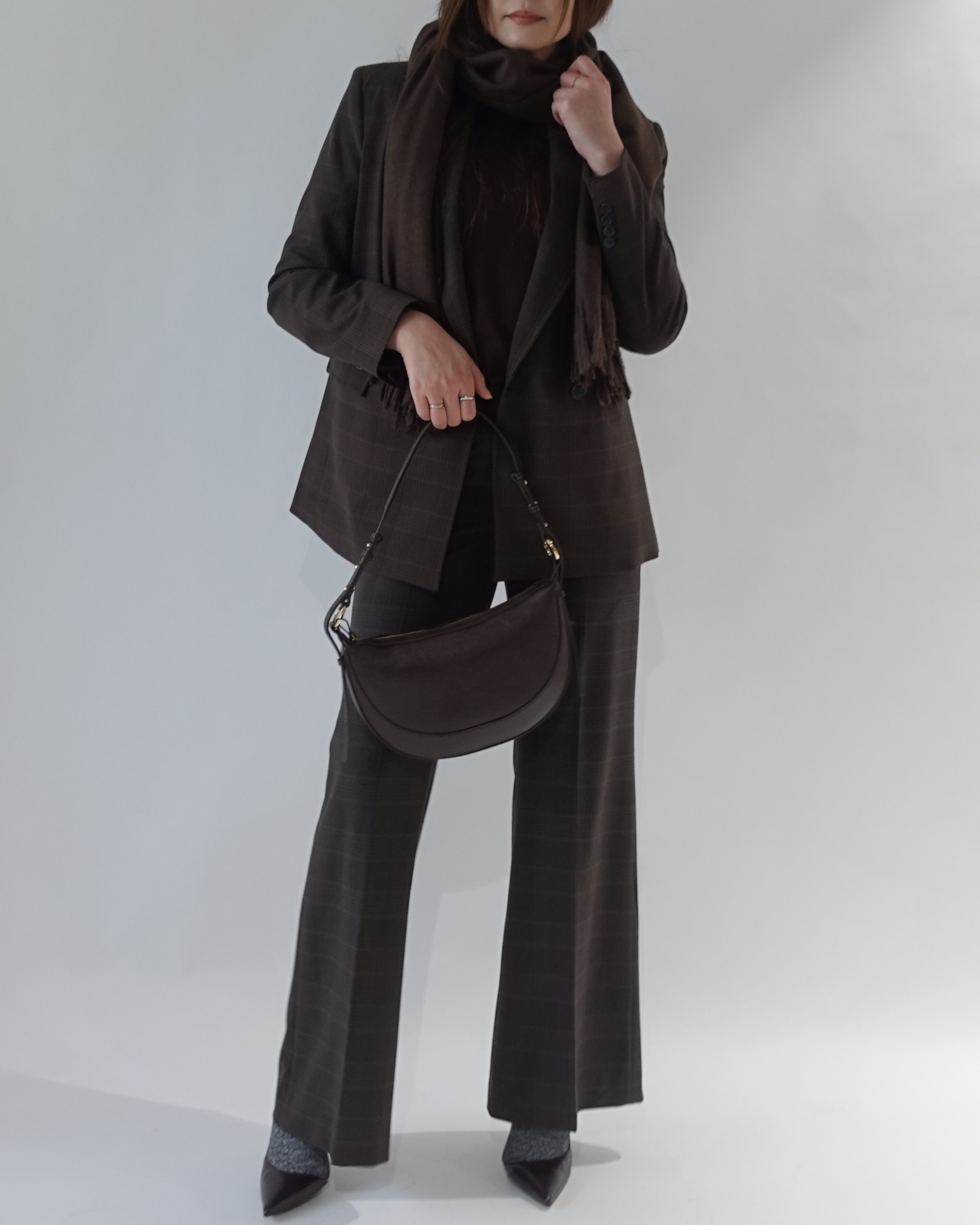 ダークトーンのチェック柄セットアップに、同系色のマフラーを合わせたハンサムな着こなし。