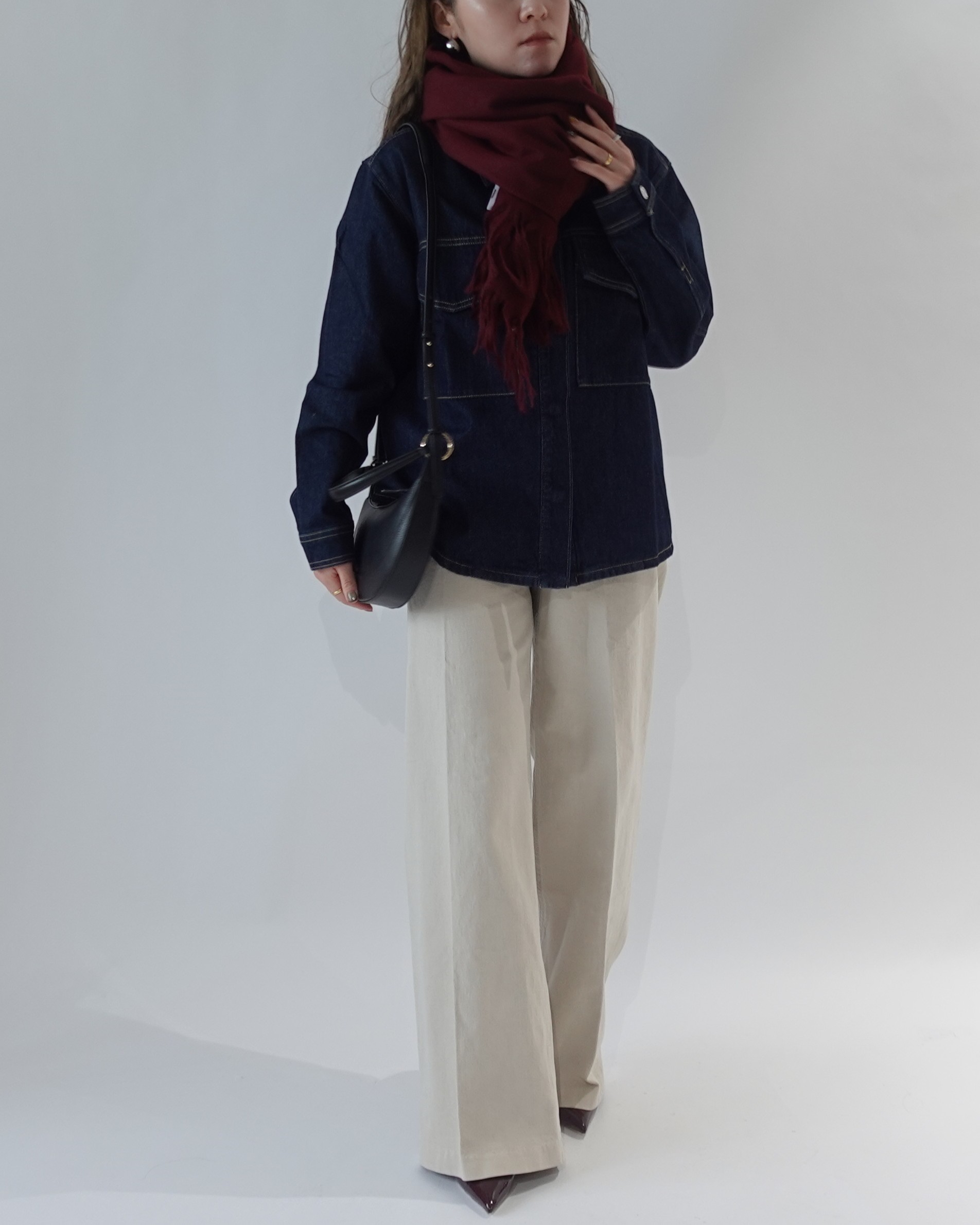 深いボルドーのマフラーを主役にした、冬~春のデニムジャケットスタイル。