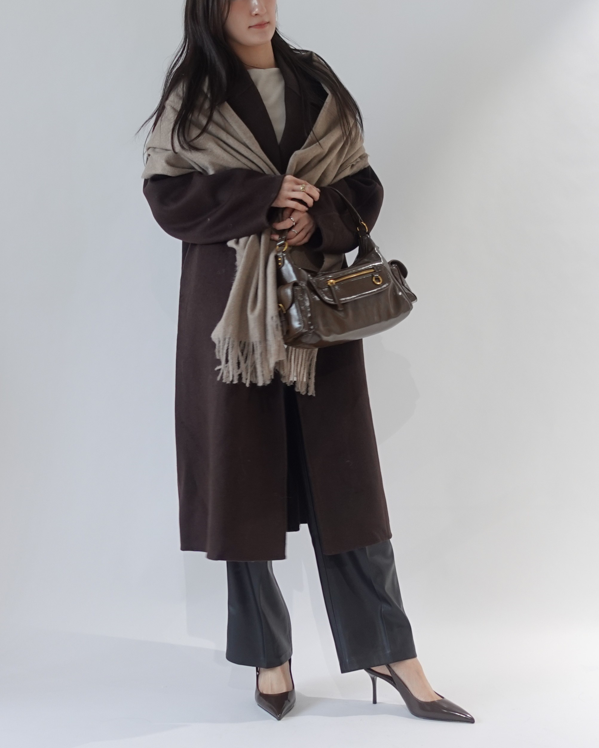 ダークブラウンのロングコートに、ニュアンスカラーの大判ストールをさらりと羽織ったキレイめスタイル。