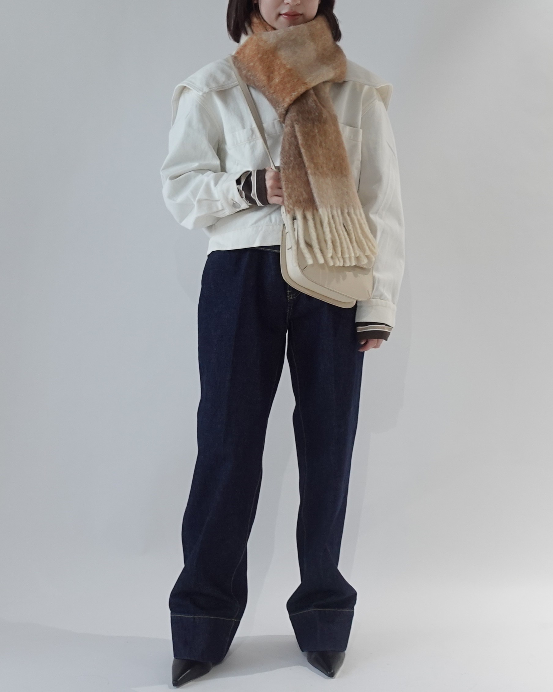 白のショート丈アウターとネイビーデニムの清潔感ある組み合わせに、暖かみのある小物が映えます。