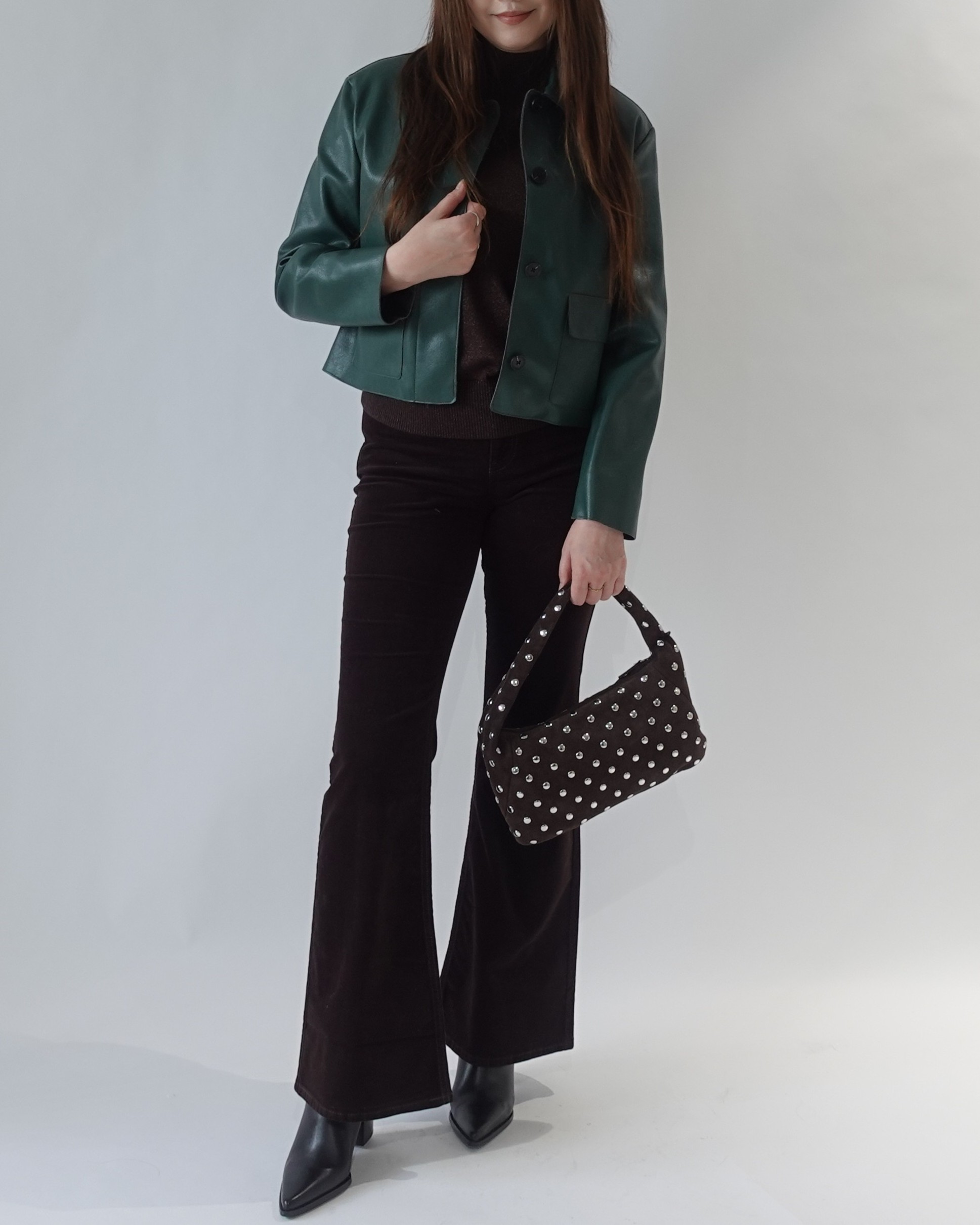 鮮やかなグリーンのショートジャケットを主役に、ブラウンのフレアパンツでスタイルアップを叶えた都会派コーデ。