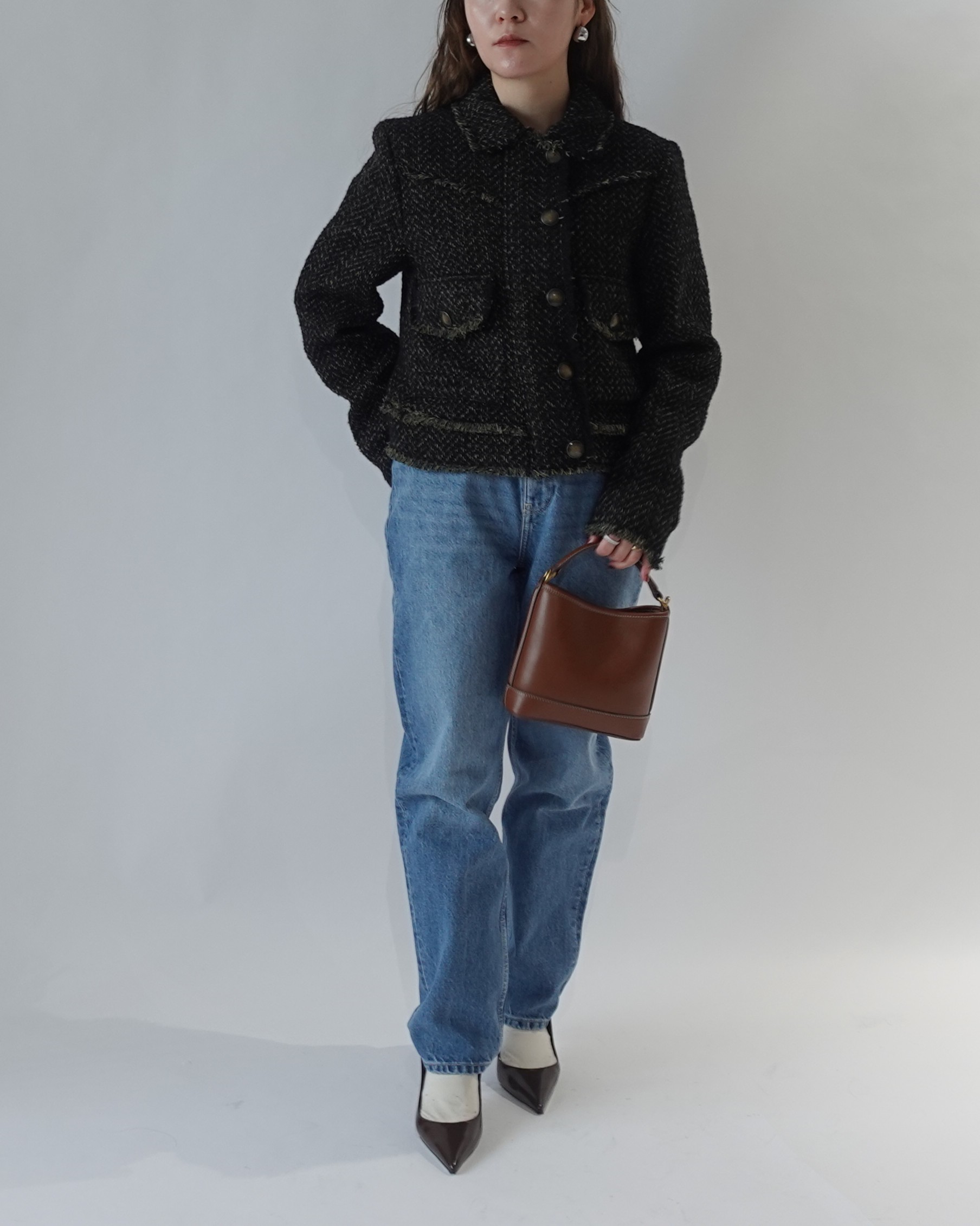 クラシカルなブラウンのツイードジャケットを、濃紺のインディゴデニムで程よくカジュアルダウン。
