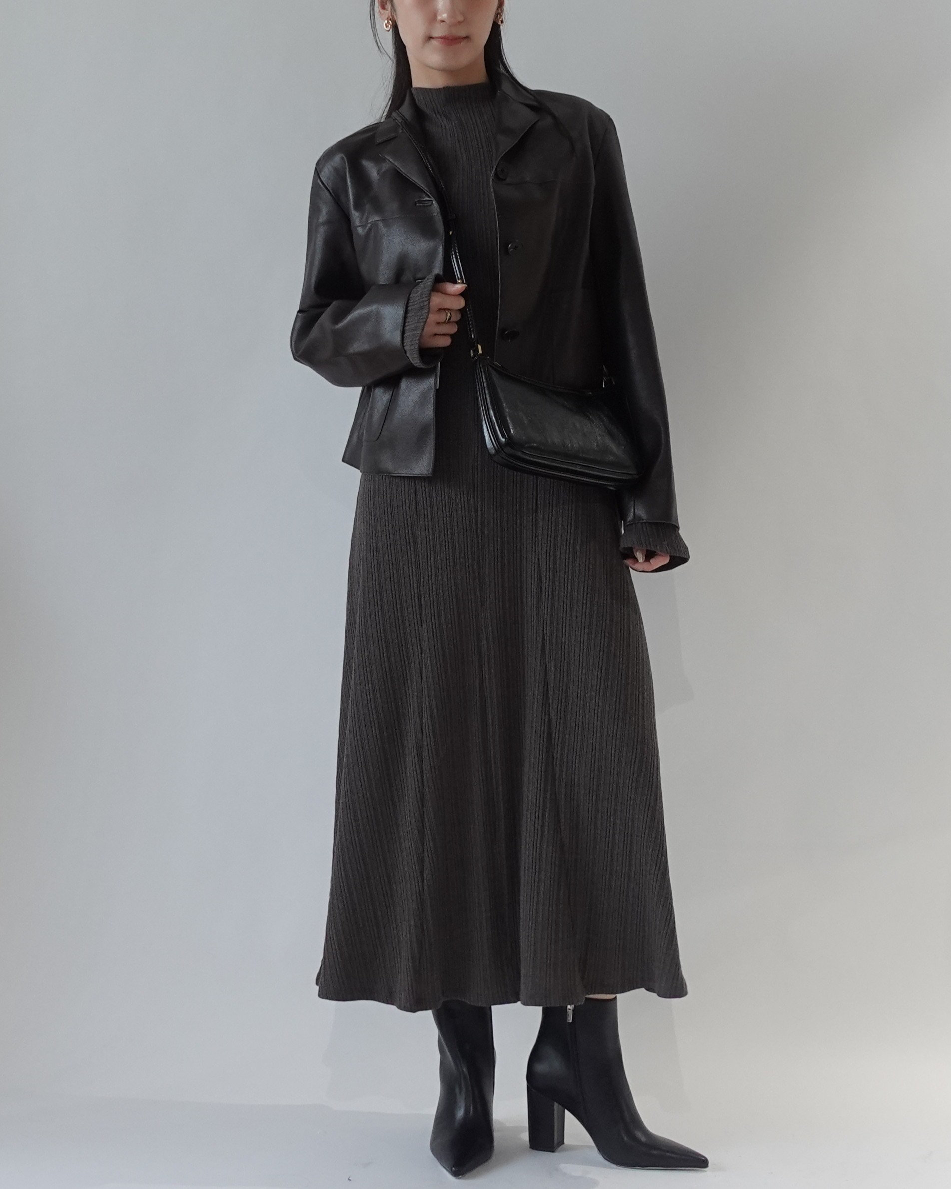 洗練されたブラックのショート丈レザージャケットに、落ち着いたグレーのロングワンピースを合わせたモードな着こなし。