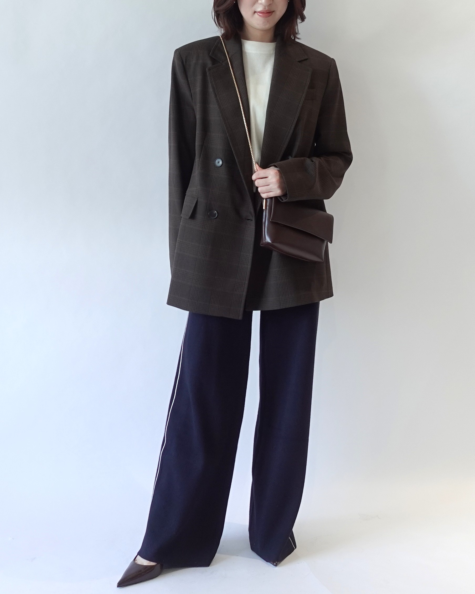 トラディショナルなダブルのチェックジャケットを主役に、あえてジャージ素材のサイドラインパンツを合わせた大胆なミックススタイル。