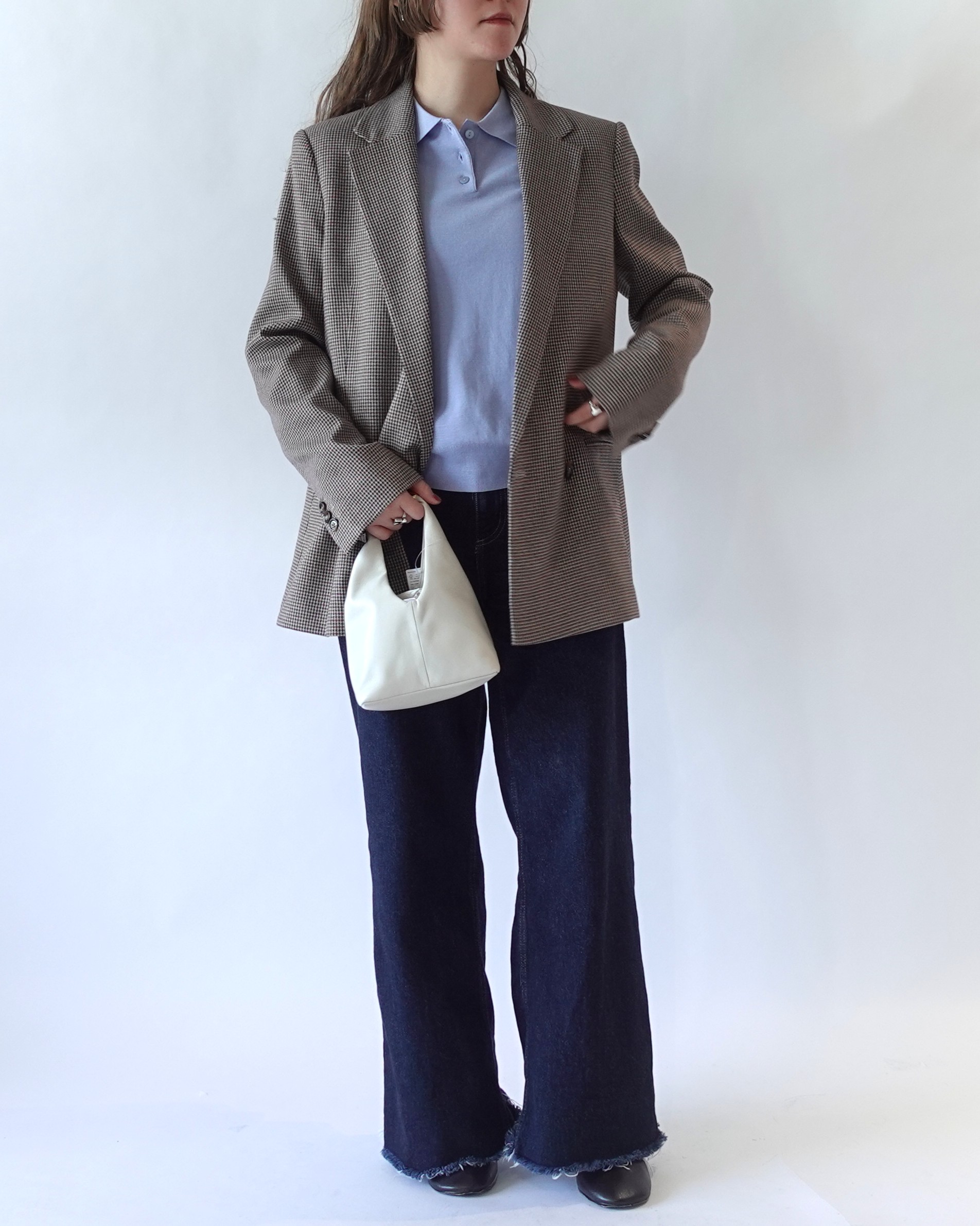 トラディショナルなチェックのジャケットを主役に、春らしい水色のポロニットと濃紺デニムでカジュアルに。