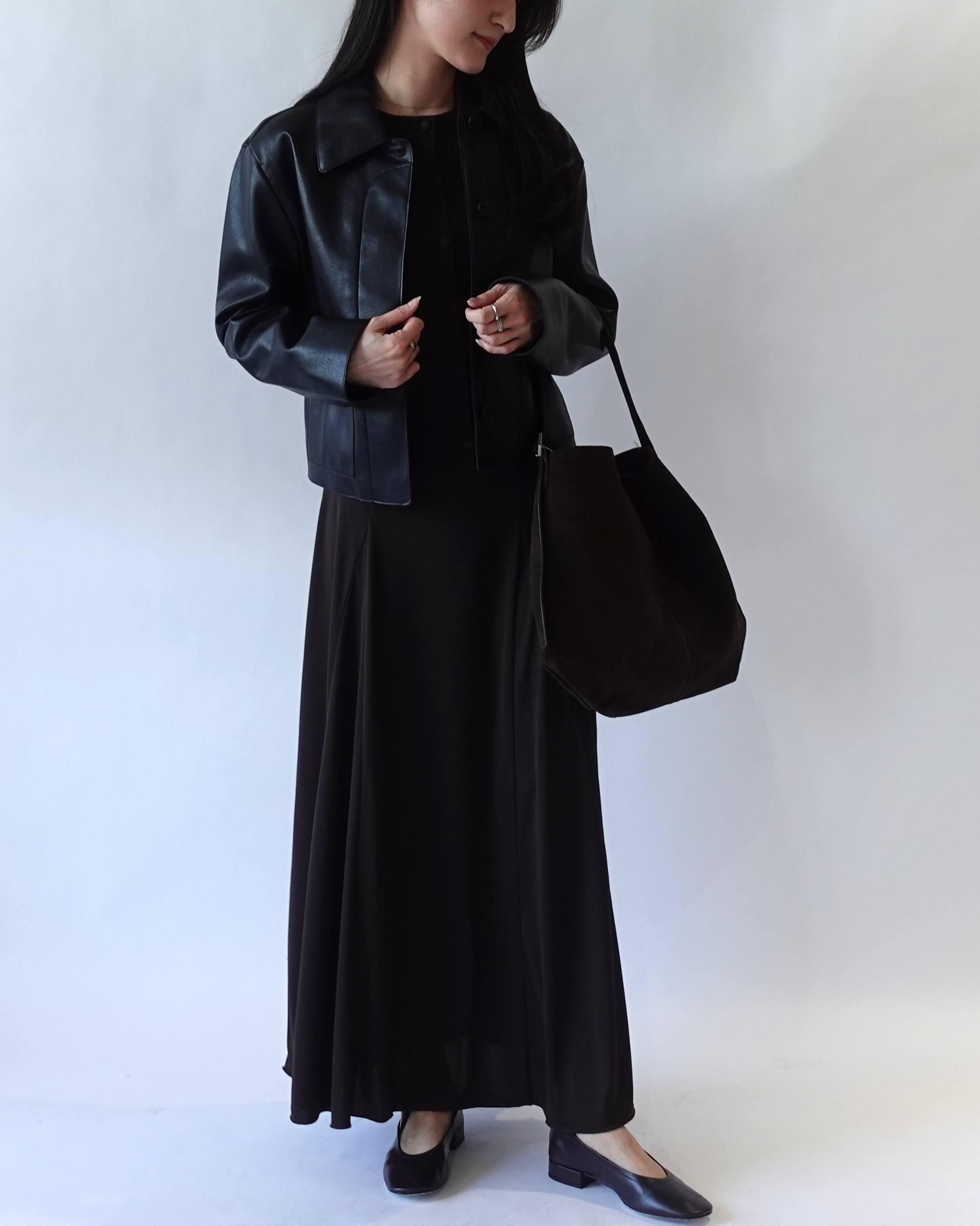 ハードな黒のレザージャケットを、しなやかなブラウンスカートでエレガントに中和した大人のミックススタイル。