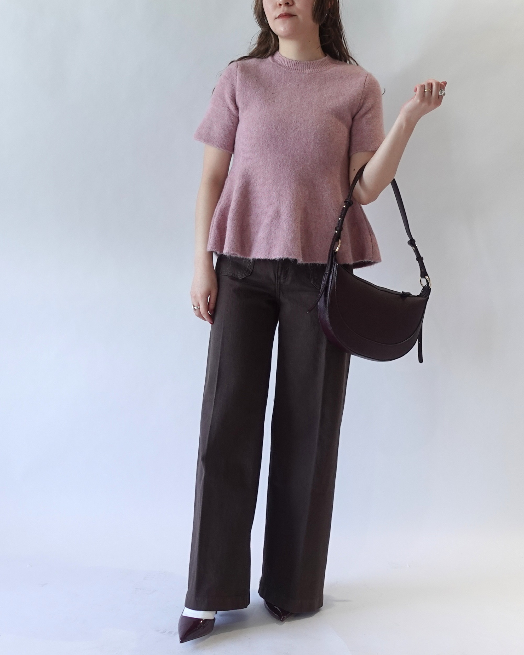フェミニンなピンクのペプラムニットを主役に、ビターなブラウンデニムで甘さを引き締めた大人可愛い装い。