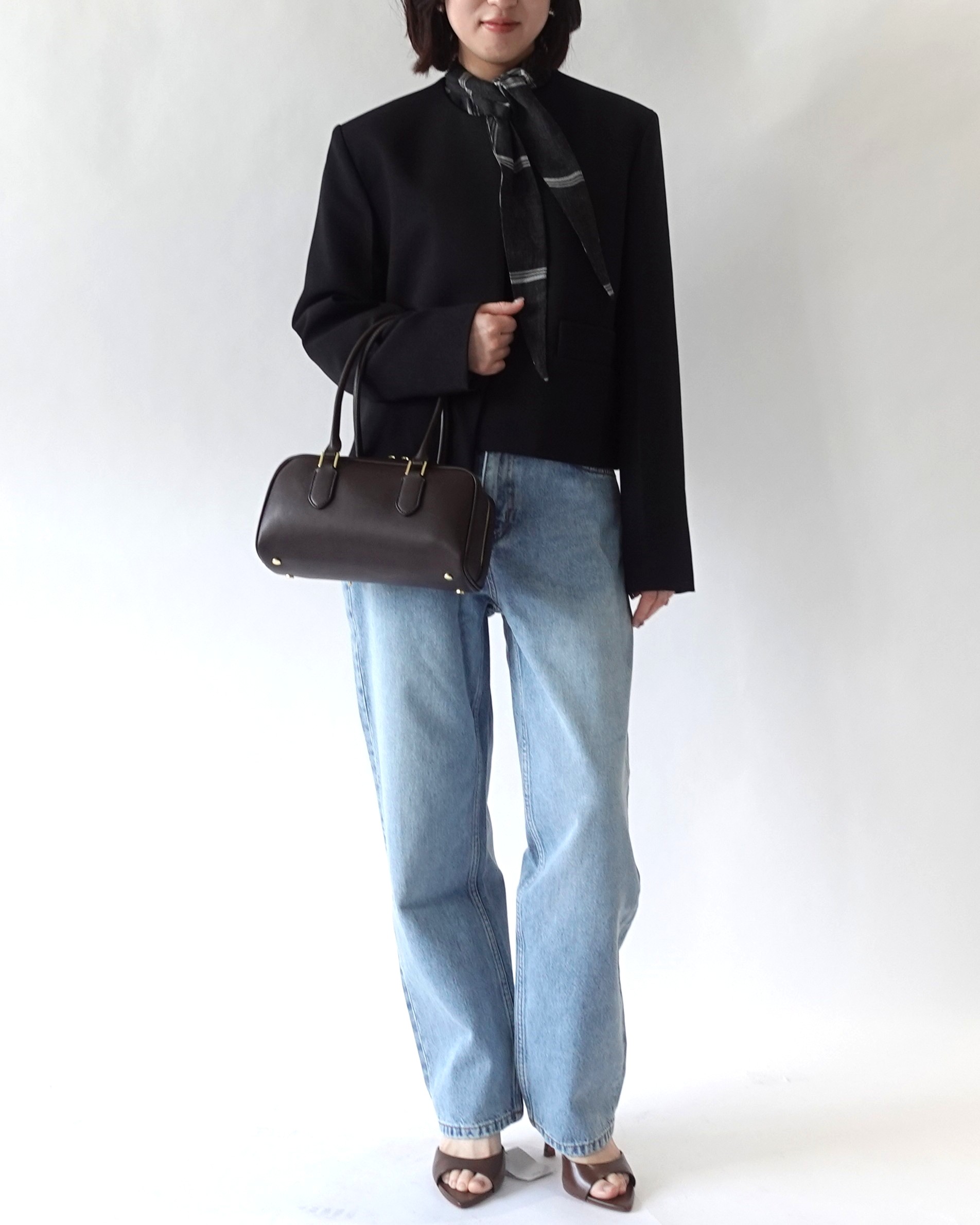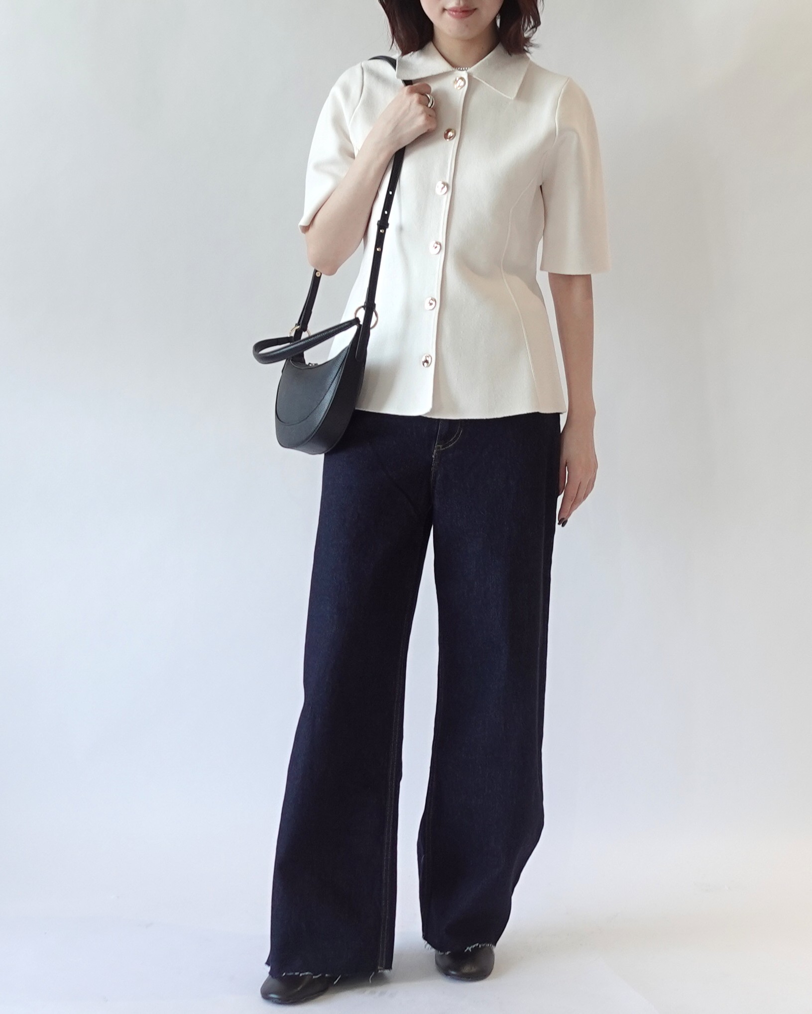 襟付きのデザインが顔周りを知的に見せ、カジュアルなデニムスタイルに程よい緊張感と上品さをプラスします。