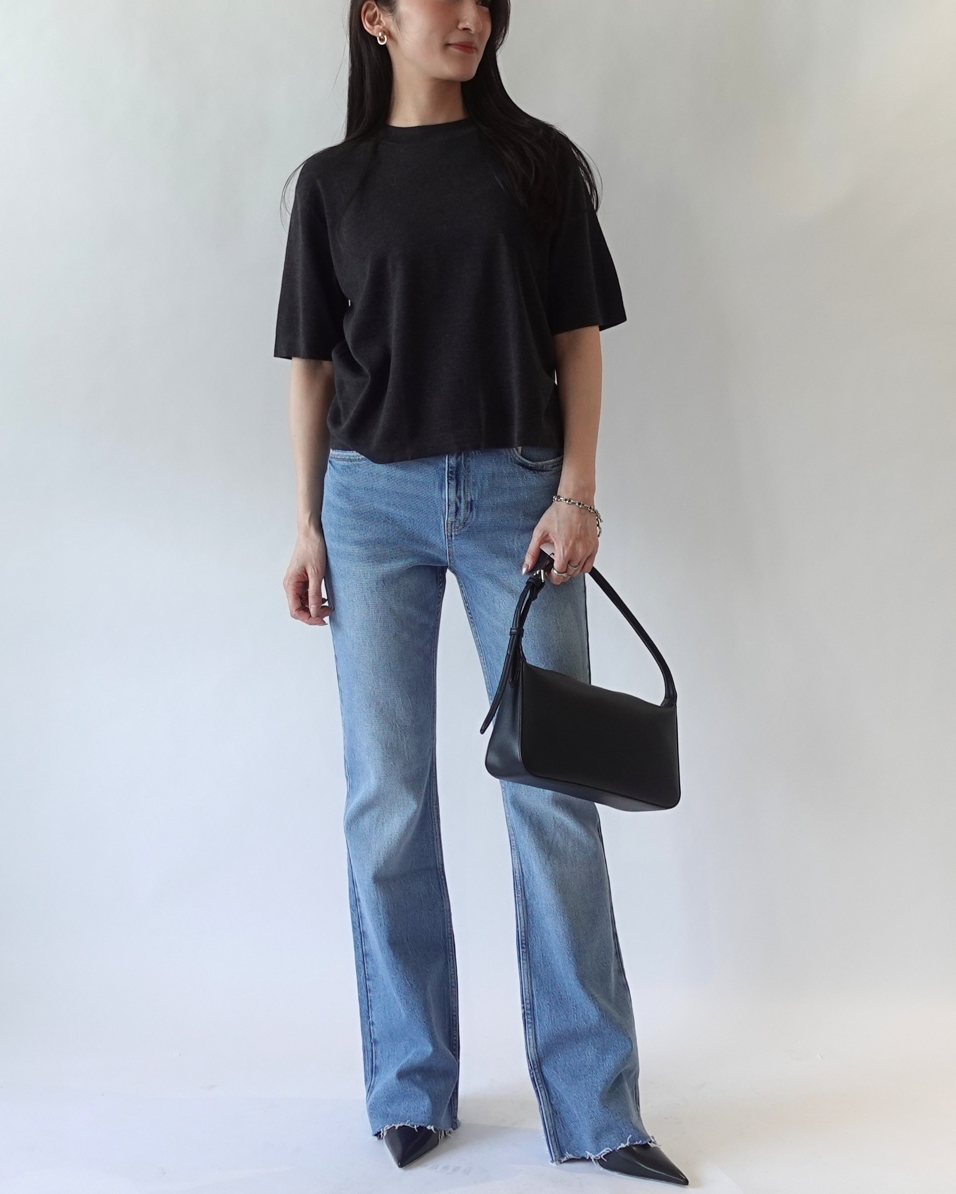柔らかな質感の上質な半袖ニットを、淡いブルーのフレアデニムに合わせたミニマルな装い。