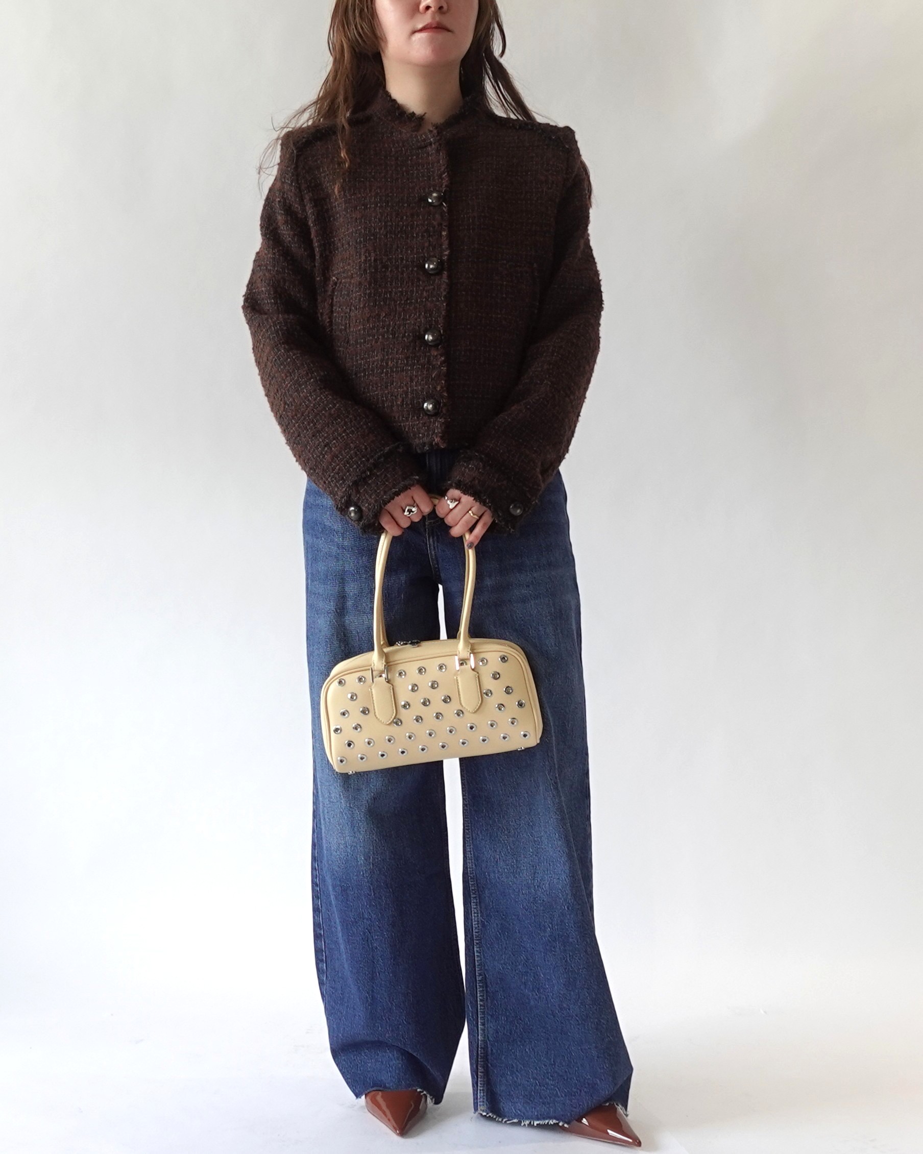 深みのあるブラウンのツイードノーカラージャケットを主役に、ワイドデニムで程よくカジュアルダウン。