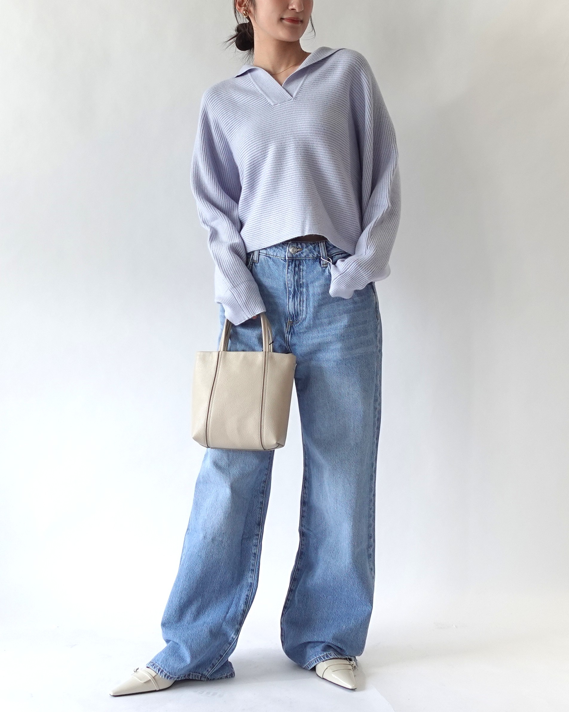 爽やかな水色のスキッパー春ニットを主役に、淡いブルーのワイドデニムを合わせたクリーンな装い。