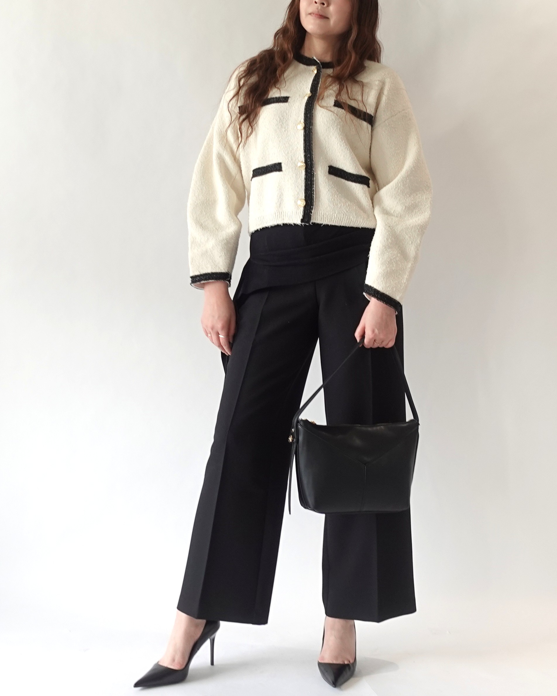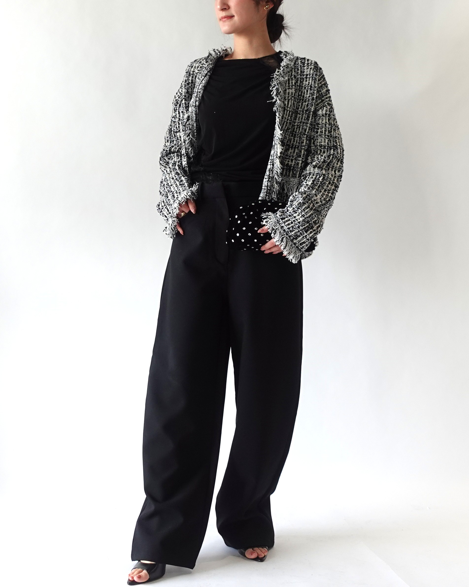 白のツイード調ノーカラージャケットを主役に、黒のトップスとワイドパンツを合わせた都会的なモノトーンスタイル。