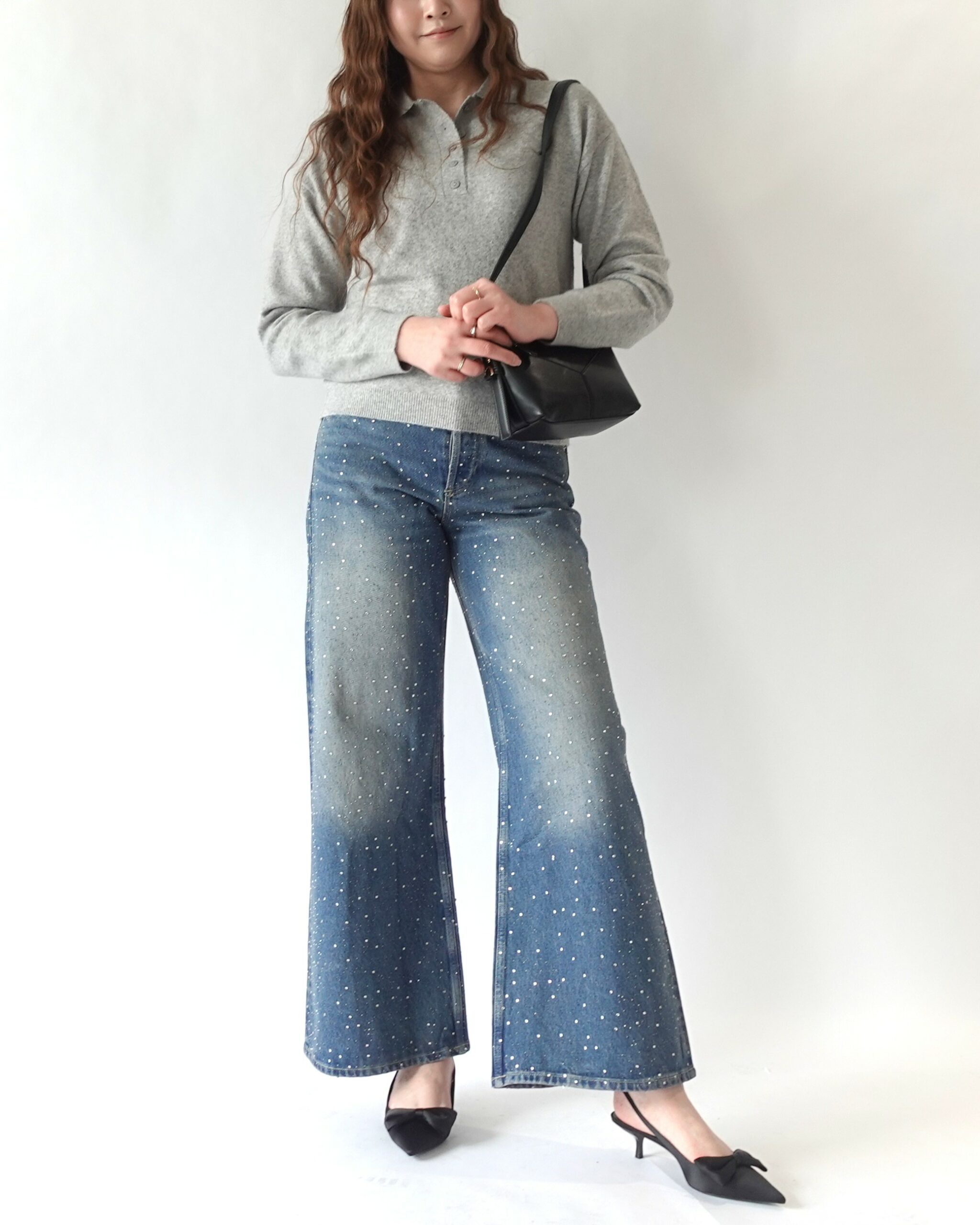 シンプルなグレーの春ニットを、ラインストーンが煌めくワイドデニムで華やかにアップデート。
