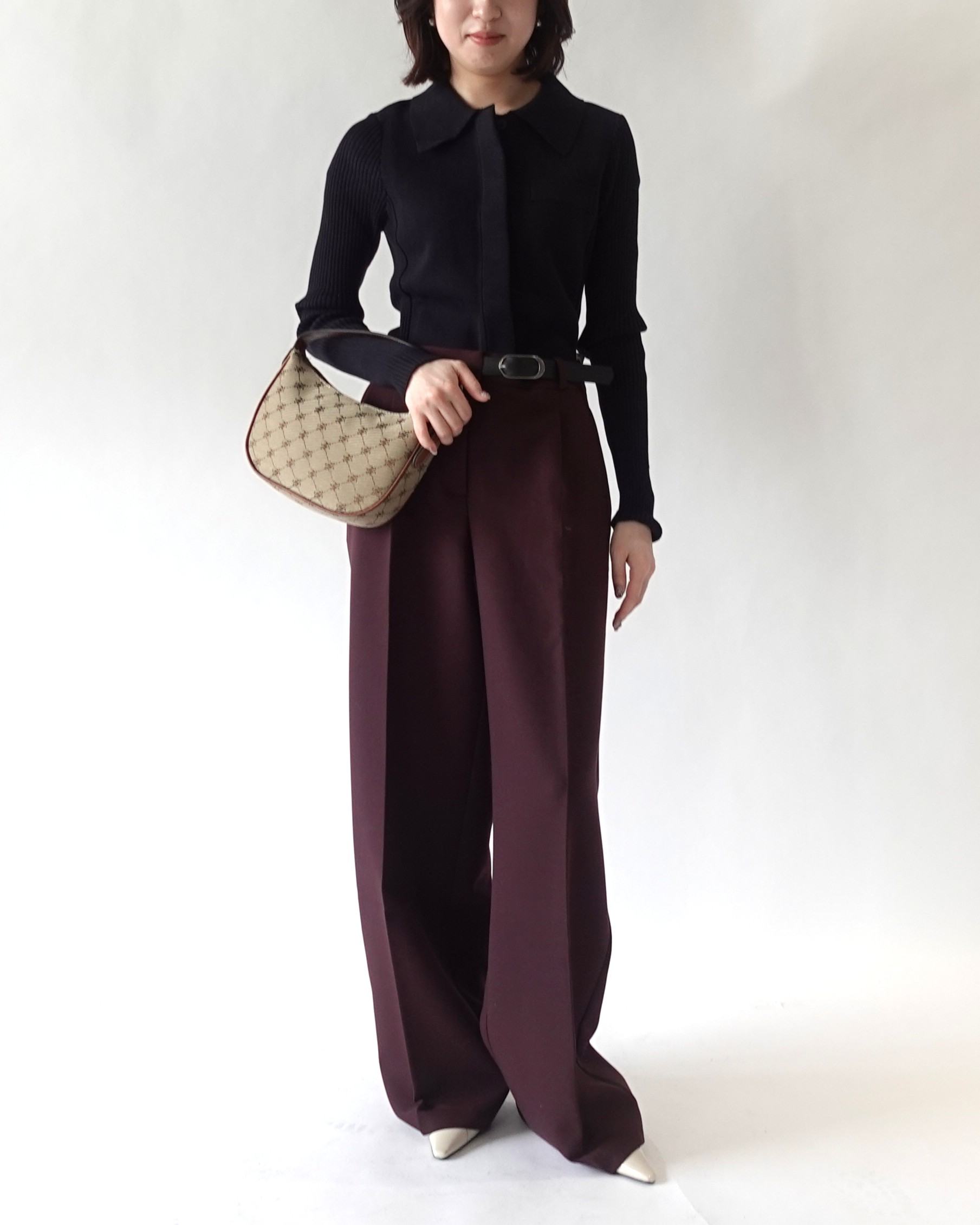 上質なブラックの春ニットを主役に、深みのあるワインレッドのワイドパンツを合わせた知的な装い。