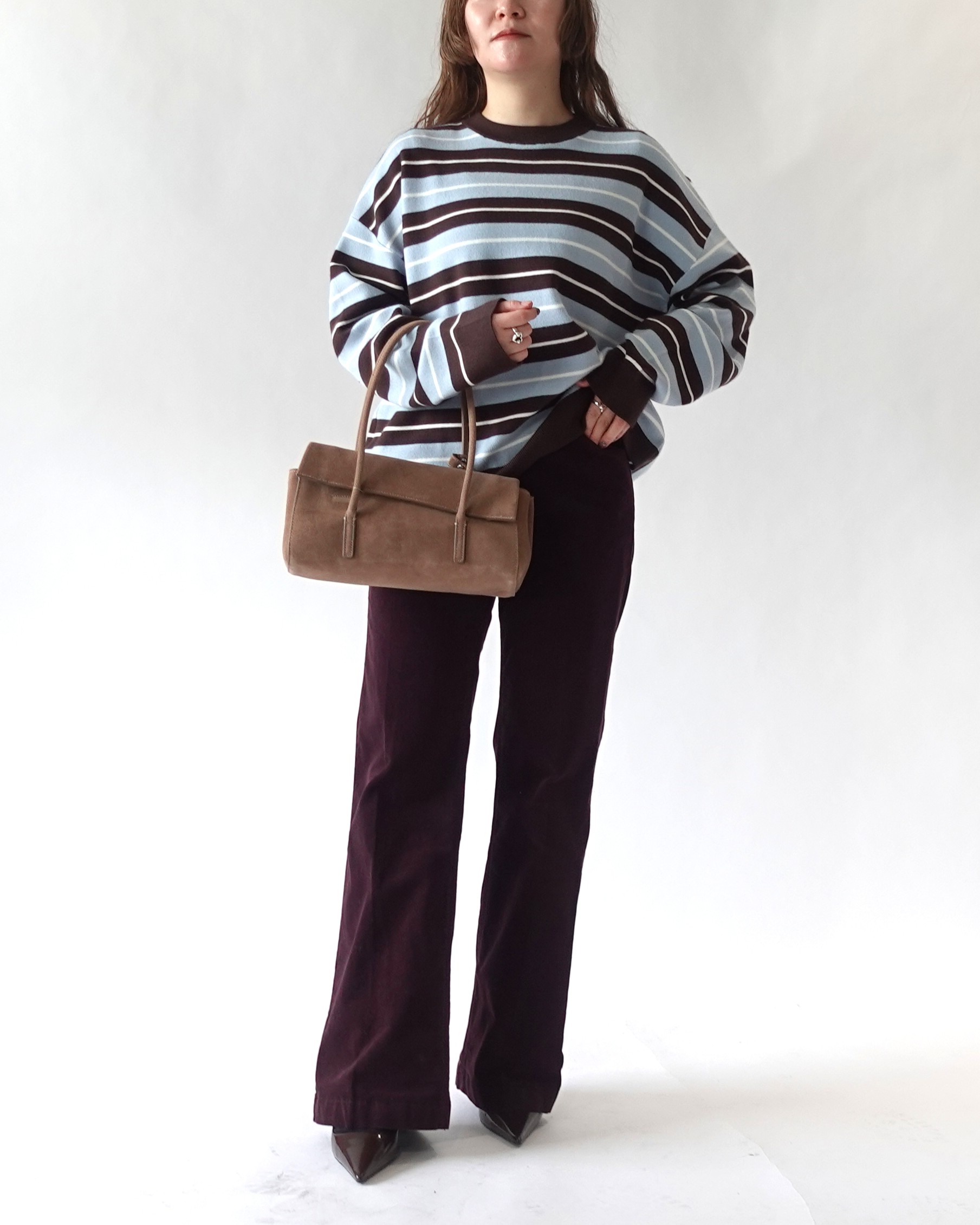 ブルー×ブラウンの配色が目を惹くボーダー春ニットを主役に、ダークレッドのパンツを合わせた上級者コーデ。