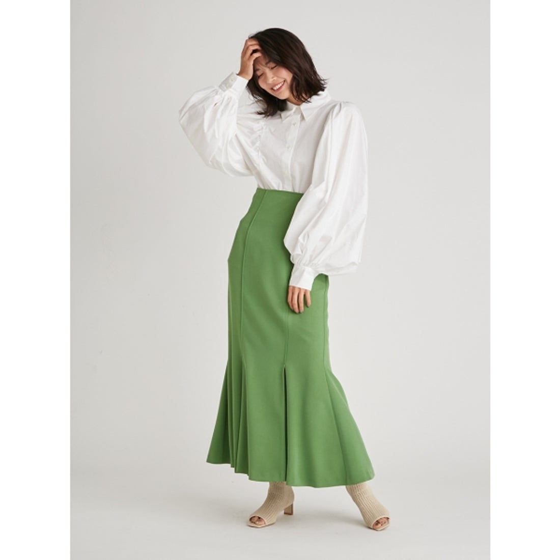 今季トレンドカラーのケリーグリーン×マーメイドスカート。このアイテム1つで、どんなコーデにも一気にトレンド感をだすことができます◎