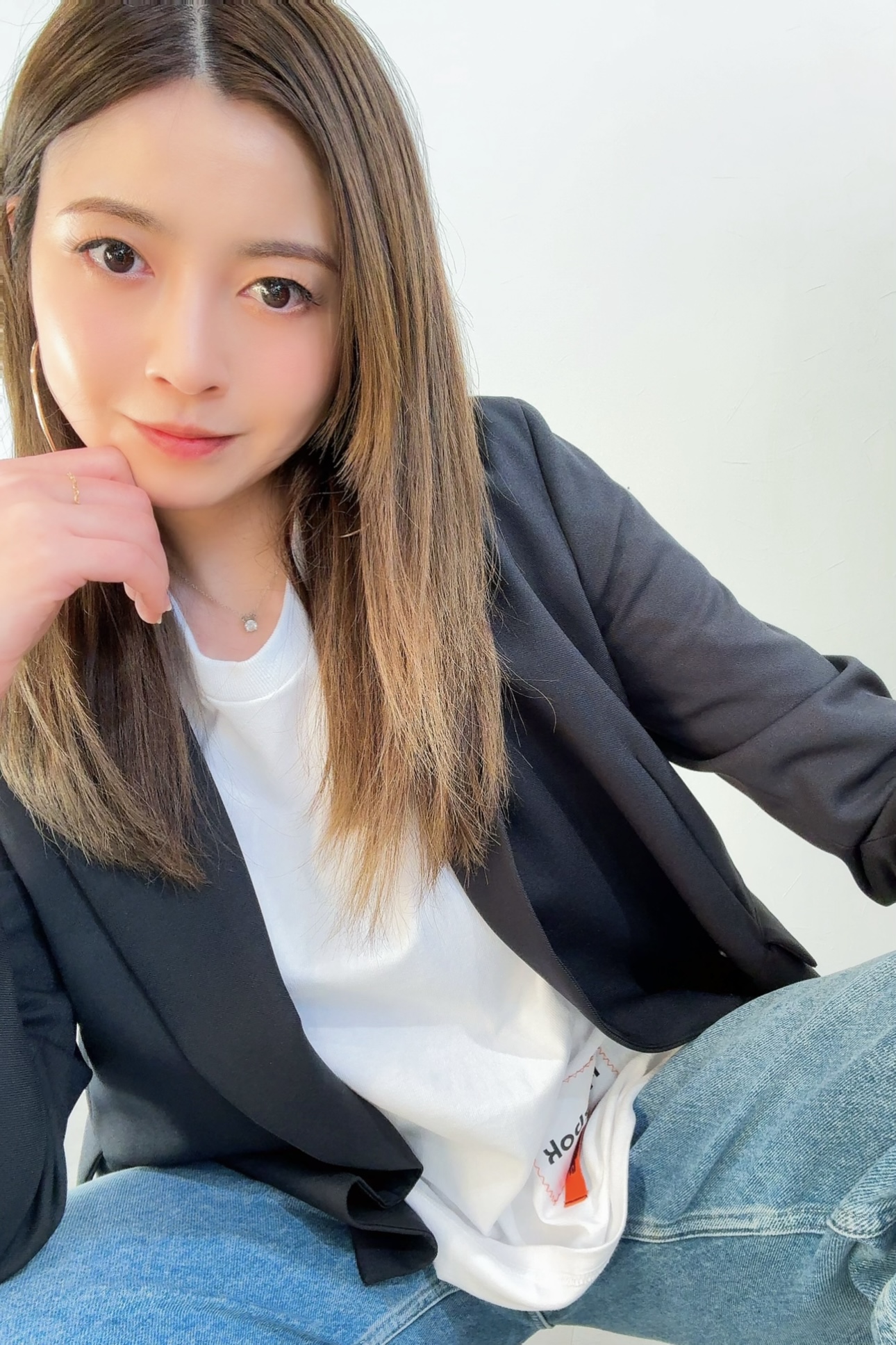 Tシャツとジーンズはワイドなシルエットで雰囲気をカジュアルにして