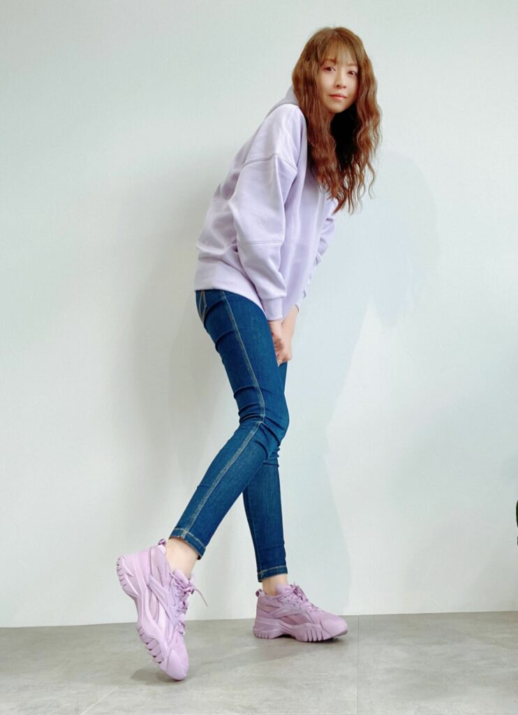 淡いパープルと好きな質感の素材でお気に入りすぎて色違いも購入しました。足元はCLUB C CARDI V2 のパープルを合わせて。カーディ・Bシリーズはどれもドンピシャで好み。