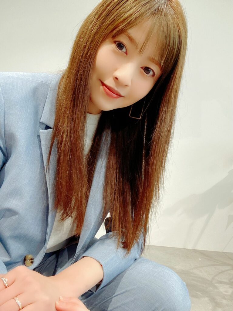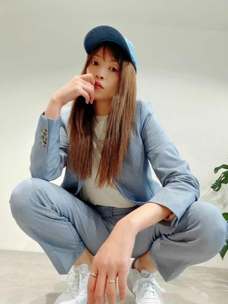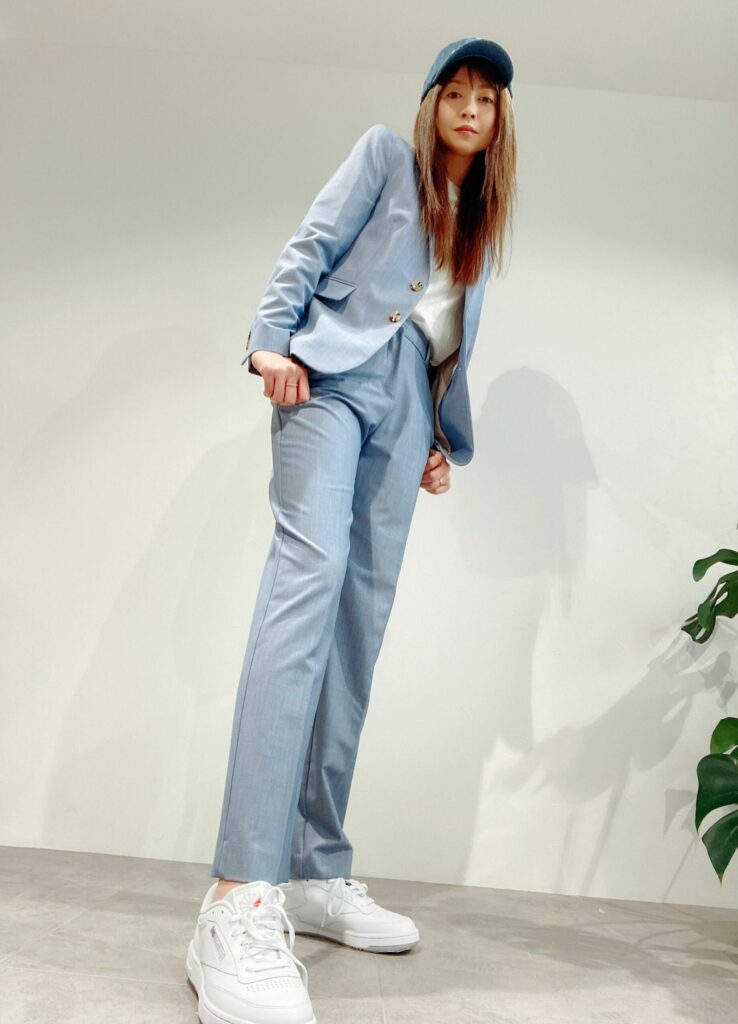 爽やかでいて柔らかなブルーのスーツセットアップをチョイス。薄いデニム風な色合いで気分を春先に。