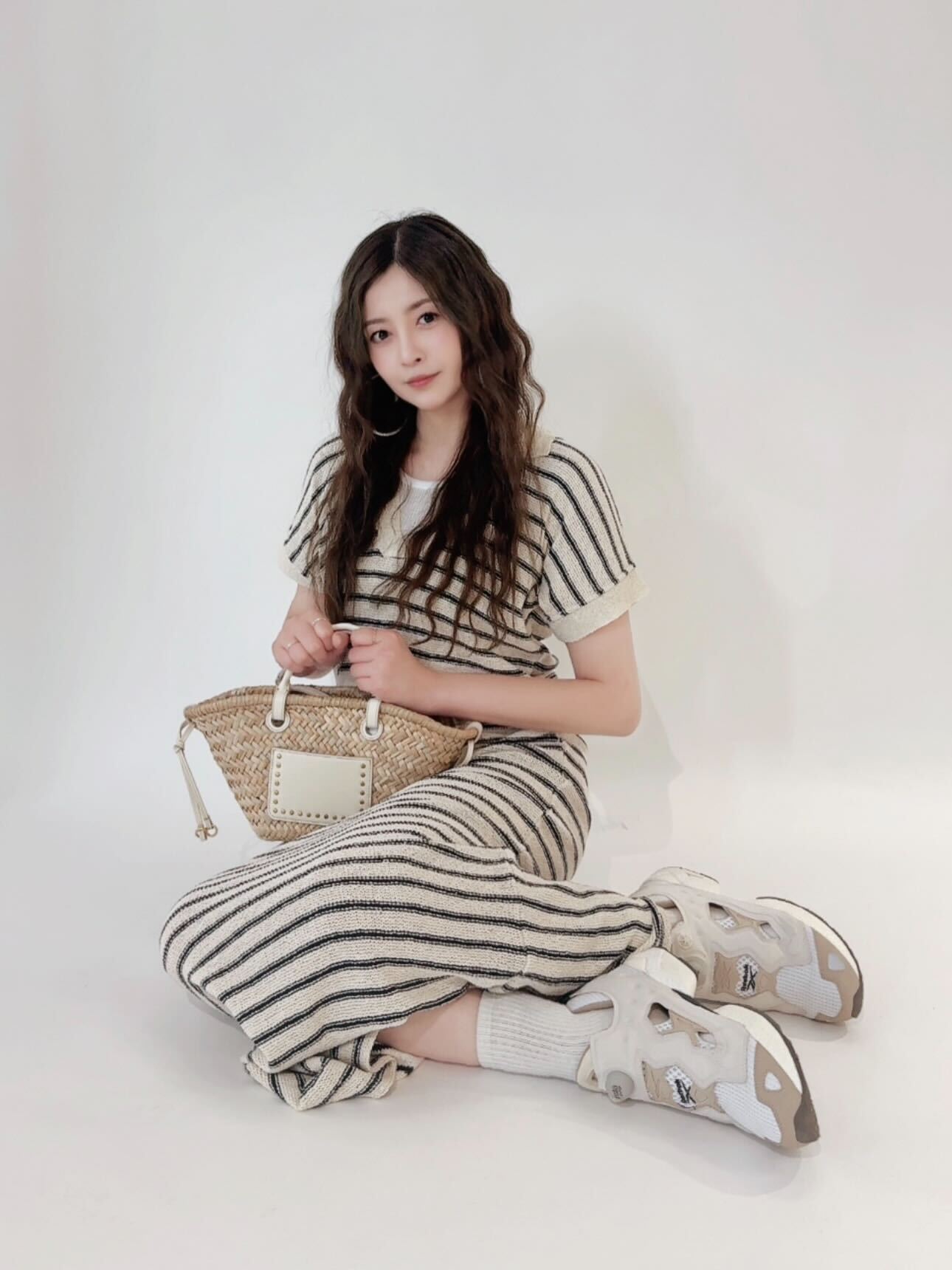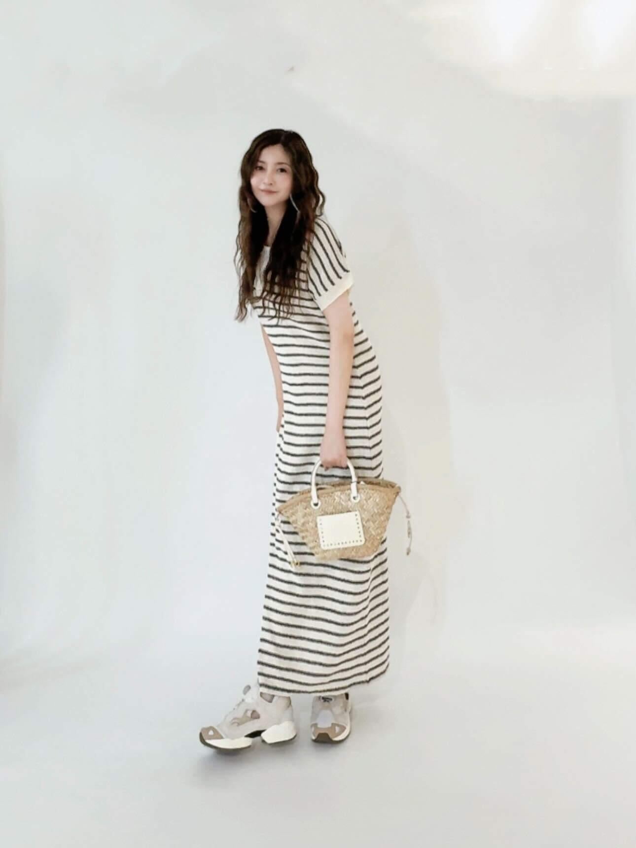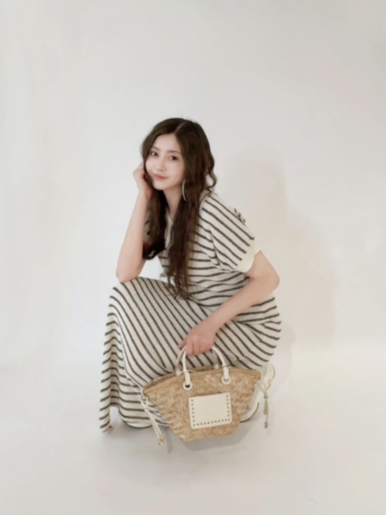 ボーダーのサマーニットワンピにかごバッグを合わせて、定番の夏コーデ。