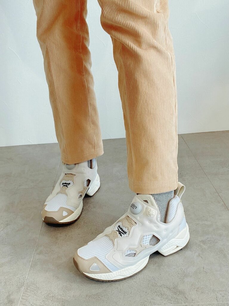 足元は特に気に入っているベージュxホワイトのポンプ。履きやすいし、主役になるスニーカーなのでシンプルなコーデやワンピースとの相性も抜群です!