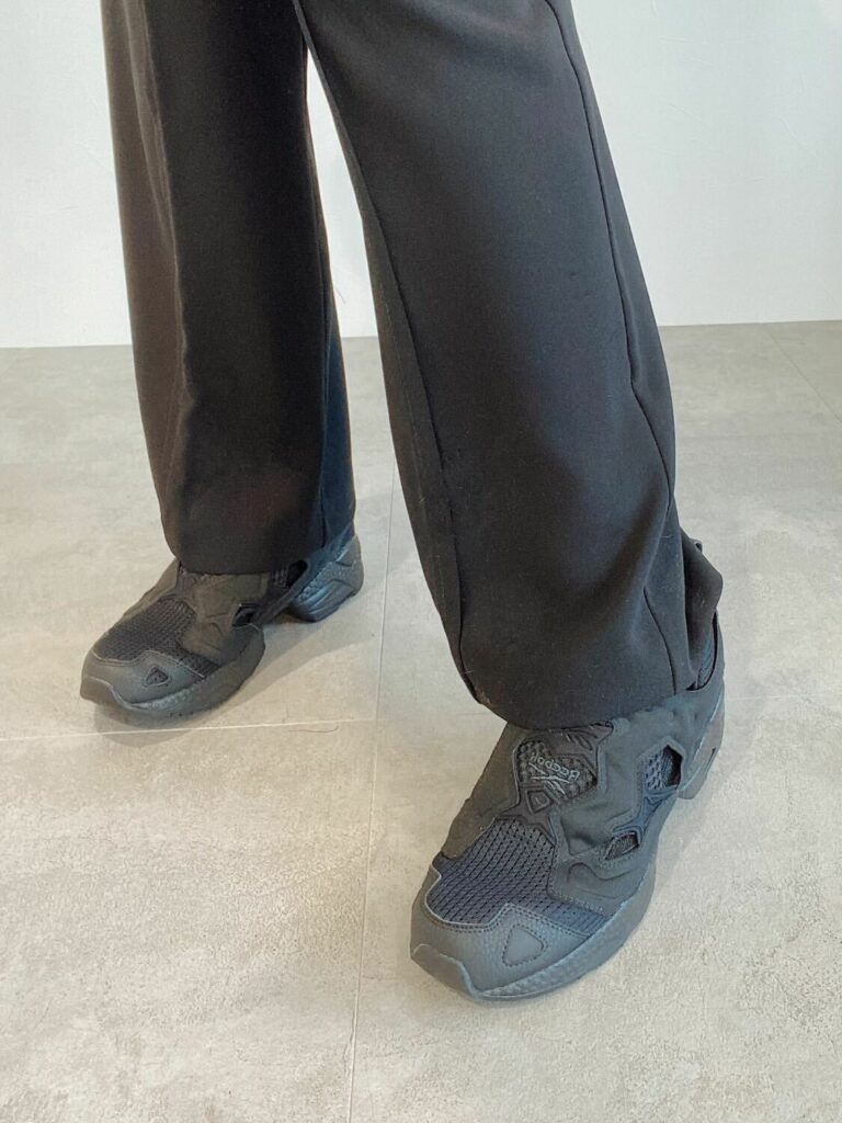 腰の高い位置でウエストマークできるので脚長効果も抜群!足元は黒のポンプフューリーでスポーティー&抜け感を出しました。肌寒い時は、これにGジャンやレザージャケットを合わせるのがオススメです。