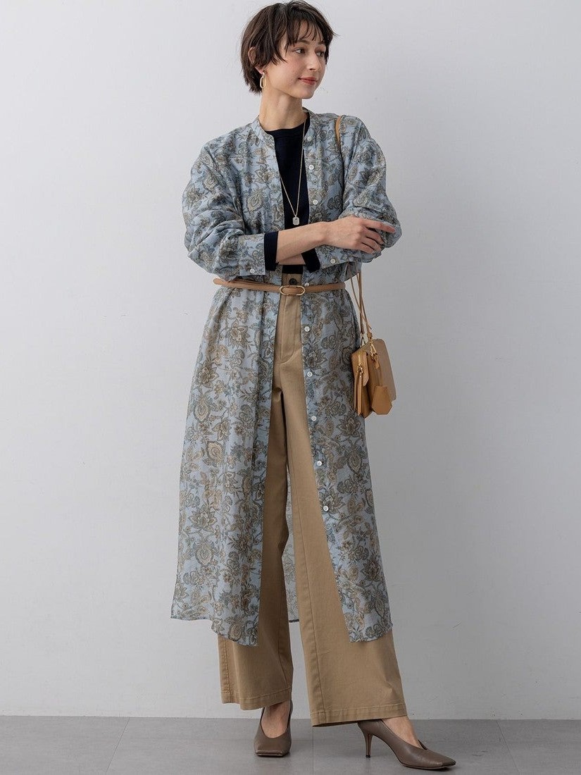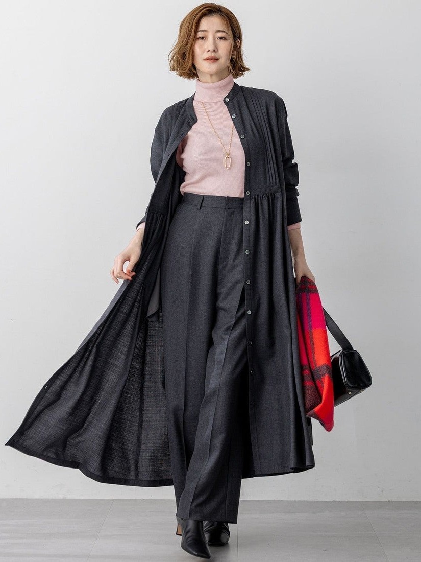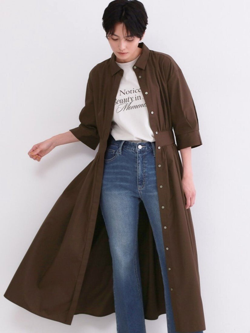 前ボタンをすべて開け、ロゴTシャツとワイドパンツの上にロングカーディガン感覚で羽織るスタイル。縦のライン(Iライン)が強調され、二の腕やヒップラインを隠しながら、こなれた大人カジュアルが完成します。