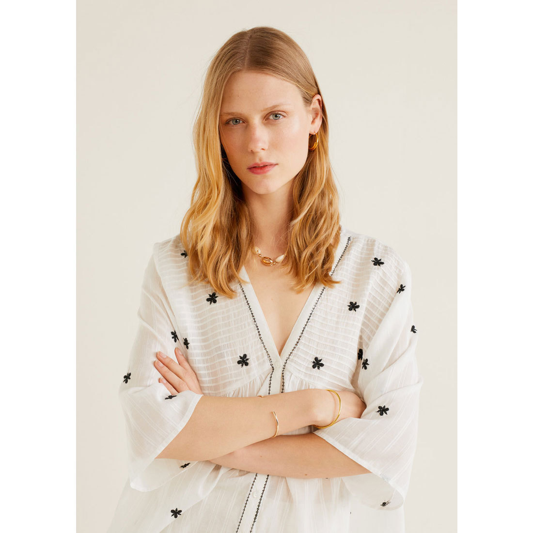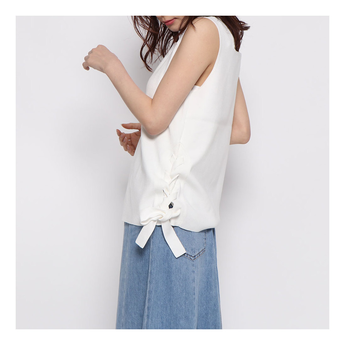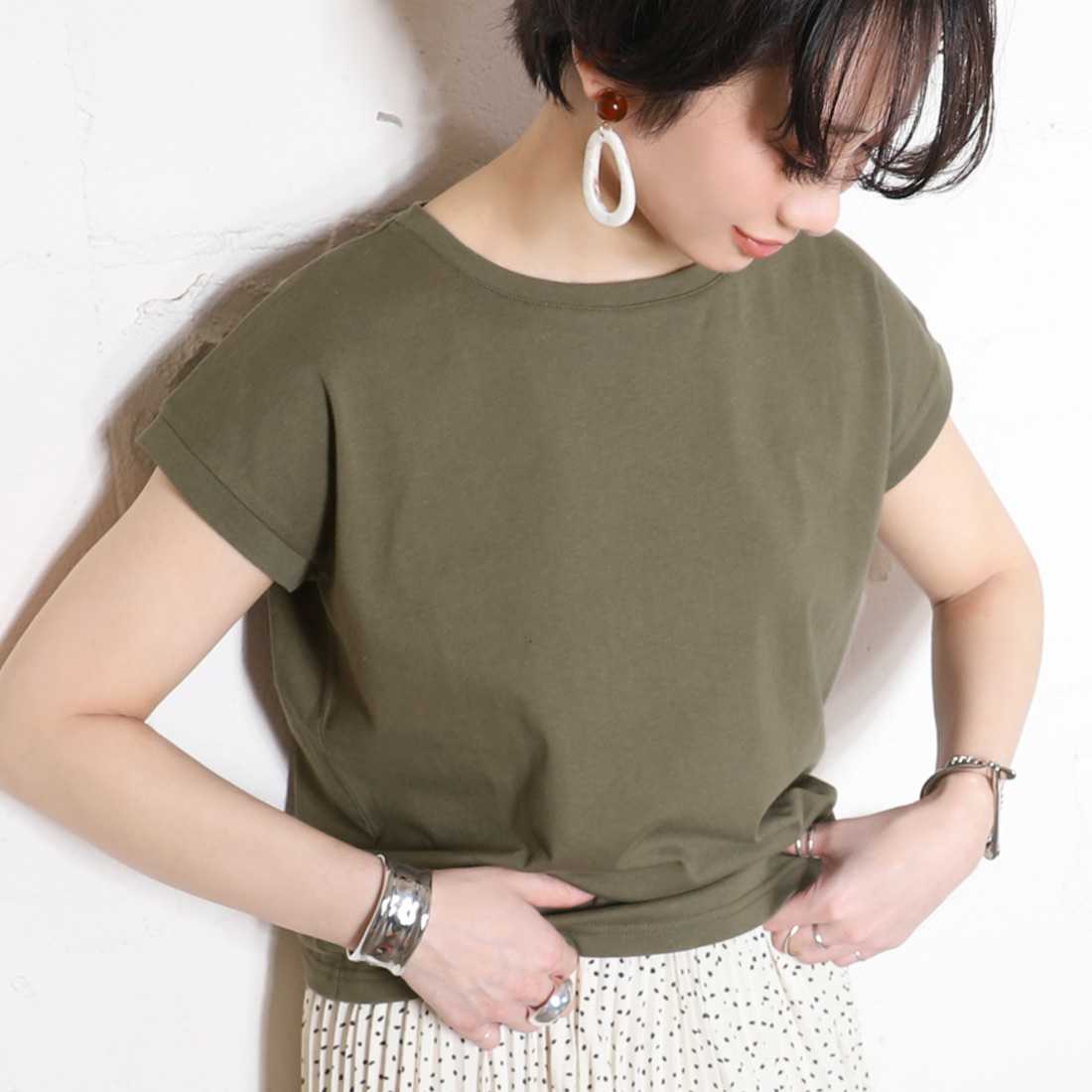 フレンチスリーブのトップスを選べば、二の腕が露出しても細見せできて◎