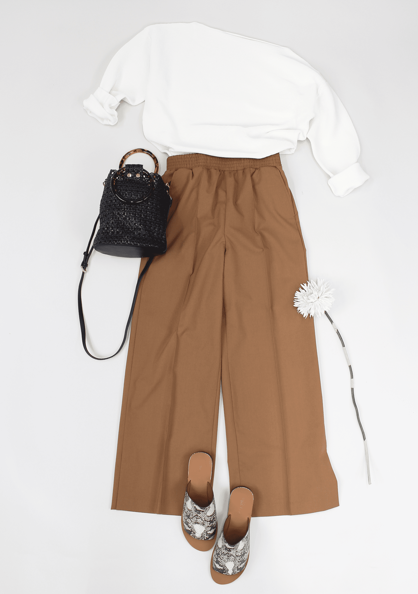 トップス¥7,800(Mila Owen) / パンツ¥8,800(Mila Owen) / バッグ¥7,490(MANGO) / 靴¥10,800(Mila Owen)